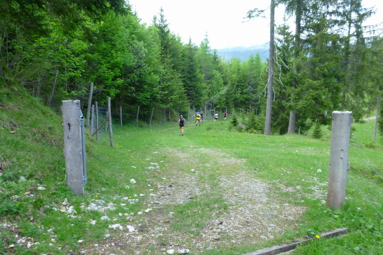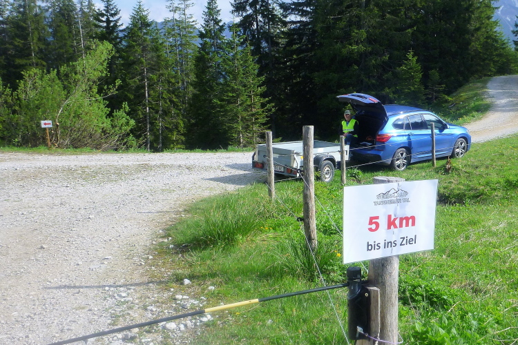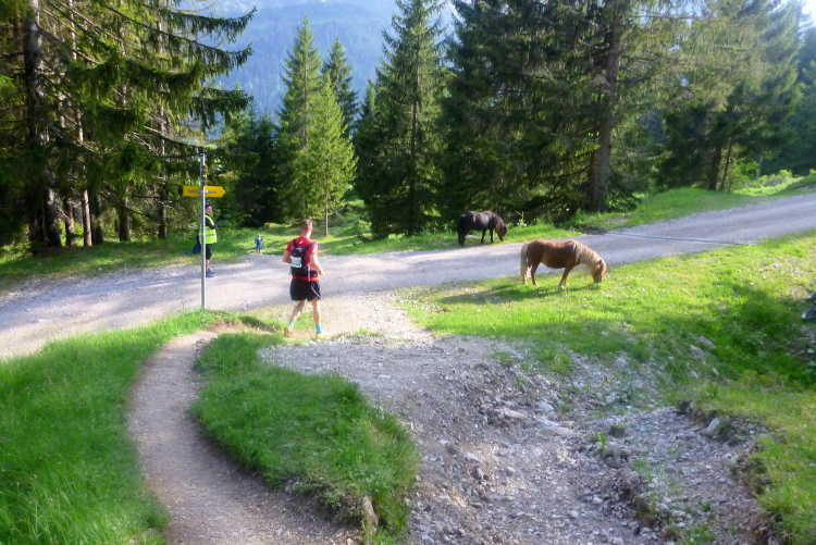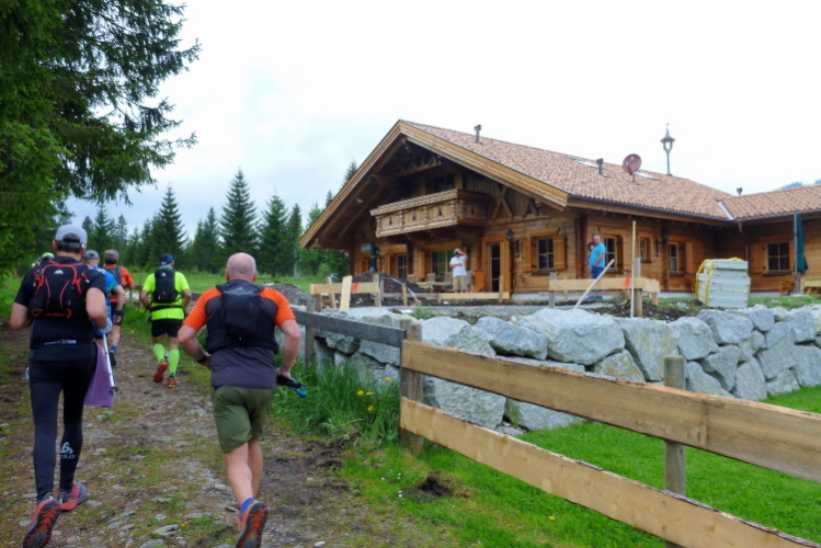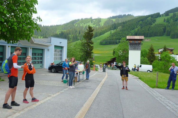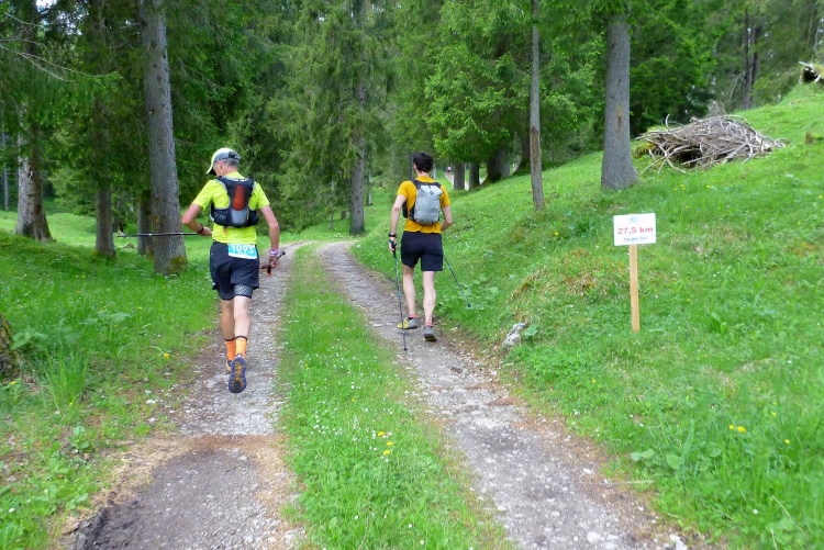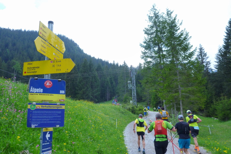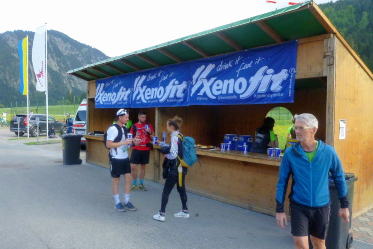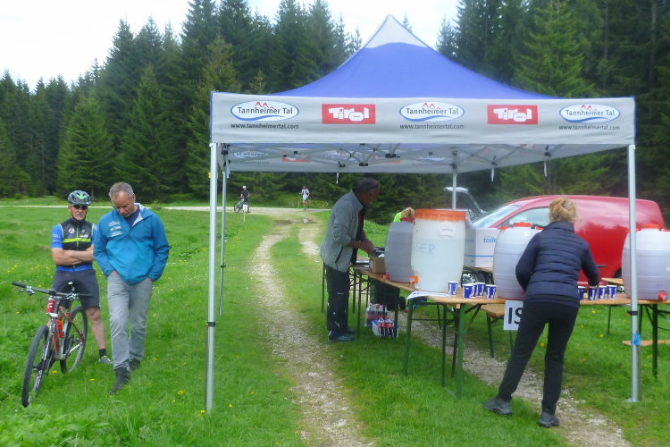 Auf den nächsten fünf km sind absolut wieder 300 Höhenmeter auf 1.400 m zu gewinnen. Zunächst entlang der Vils, dem 36 km langen linken Zufluß des Lechs, schrauben wir uns über zahlreiche Serpentinen aufwärts. Die Aussicht auf die uns umgebenden Berge und ins Tal sind klasse. Das ist auch der nächste VP, von dem mir bereits zahlreiche, schnellere Läufer entgegenkommen und an dem die Hälfte der Strecke geschafft ist. Auch wird die Zwischenzeit genommen. Nach dem Auftanken will ich geradeaus weiterlaufen, dahin, wo die Läufer herkommen. „Wo mogst hi?“, ruft man mir hinterher. Den Richtungspfeil nach rechts entdecke ich erst hinterher auf dem Foto, denn ich hatte nur Augen für die Verpflegung. Gut, daß hier aufgepaßt wurde. Über einen sensationellen Wiesentrail verlieren wir wieder gute 50 Hm, es ist die pure Lust zu laufen. Dazu kommt das optimale Wetter: Trocken, weitestgehend bedeckt und trotzdem mild, absolut perfekt. Über einen Schotterweg kehren wir zum gleichen VP zurück, gute 17 km befinden sich auf der Habenseite.