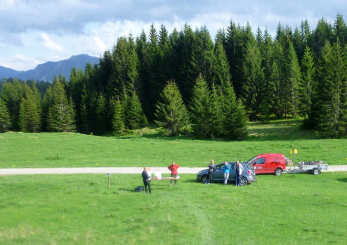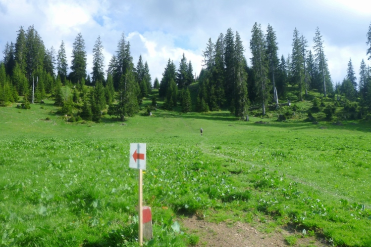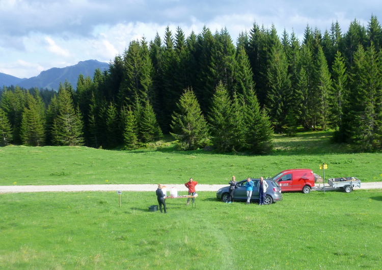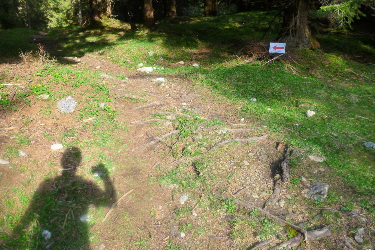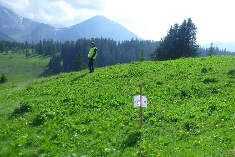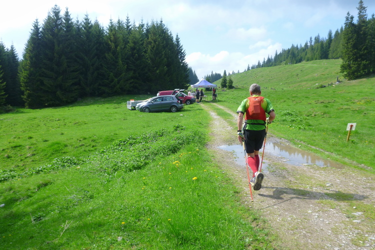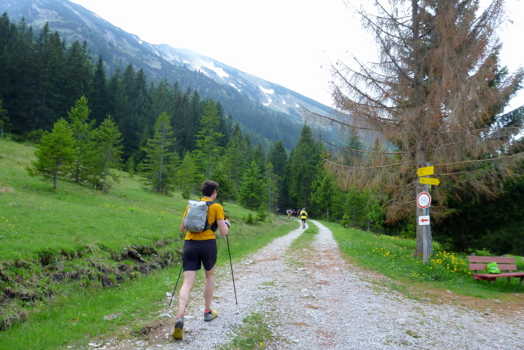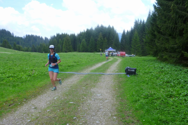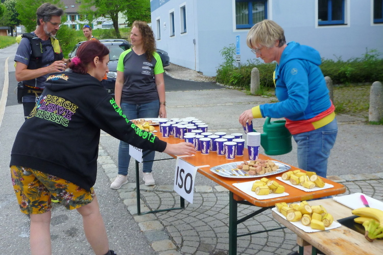 Auf den nächsten fünf km sind absolut wieder 300 Höhenmeter auf 1.400 m zu gewinnen. Zunächst entlang der Vils, dem 36 km langen linken Zufluß des Lechs, schrauben wir uns über zahlreiche Serpentinen aufwärts. Die Aussicht auf die uns umgebenden Berge und ins Tal sind klasse. Das ist auch der nächste VP, von dem mir bereits zahlreiche, schnellere Läufer entgegenkommen und an dem die Hälfte der Strecke geschafft ist. Auch wird die Zwischenzeit genommen. Nach dem Auftanken will ich geradeaus weiterlaufen, dahin, wo die Läufer herkommen. „Wo mogst hi?“, ruft man mir hinterher. Den Richtungspfeil nach rechts entdecke ich erst hinterher auf dem Foto, denn ich hatte nur Augen für die Verpflegung. Gut, daß hier aufgepaßt wurde. Über einen sensationellen Wiesentrail verlieren wir wieder gute 50 Hm, es ist die pure Lust zu laufen. Dazu kommt das optimale Wetter: Trocken, weitestgehend bedeckt und trotzdem mild, absolut perfekt. Über einen Schotterweg kehren wir zum gleichen VP zurück, gute 17 km befinden sich auf der Habenseite.