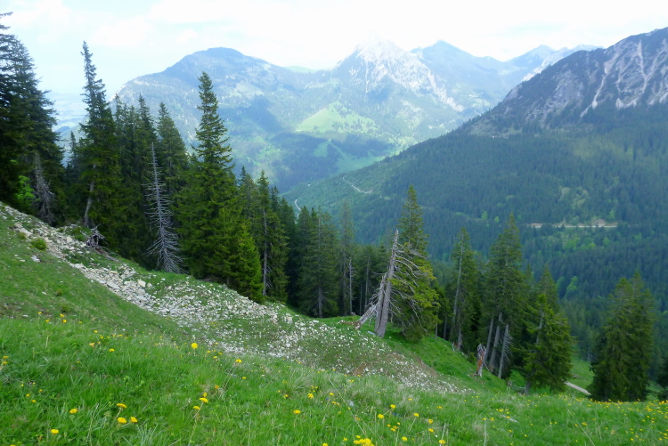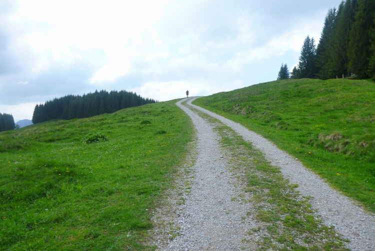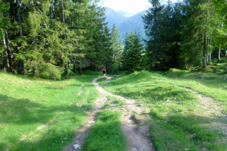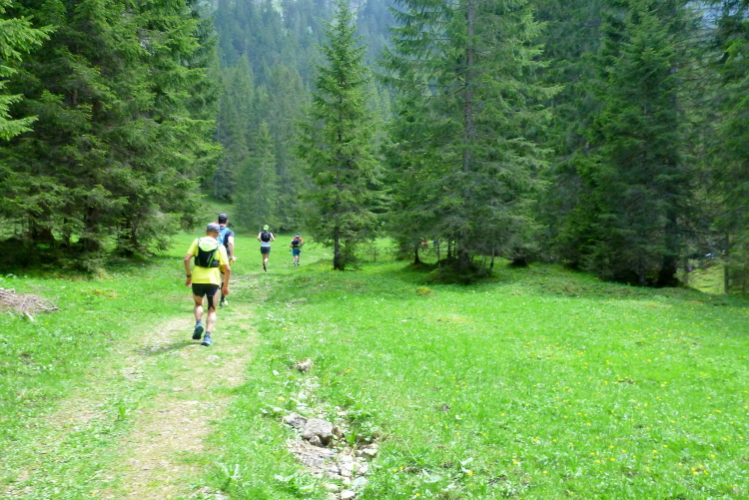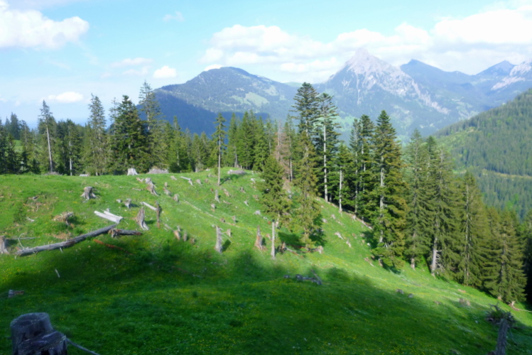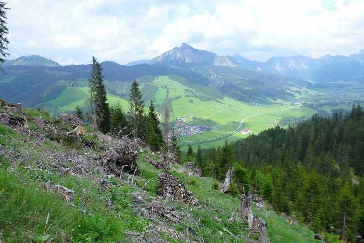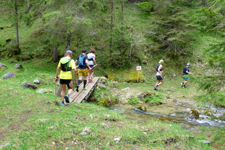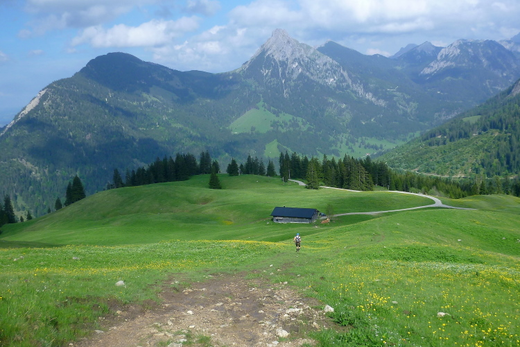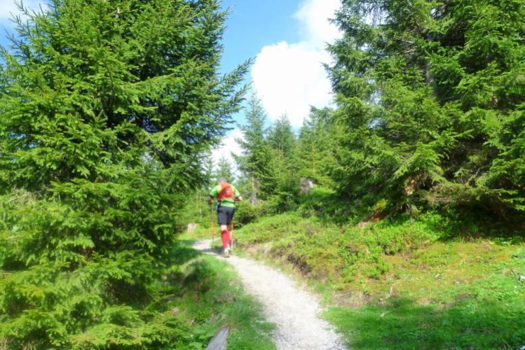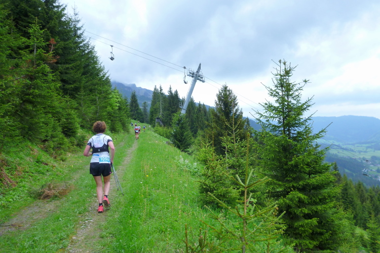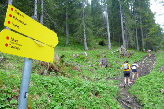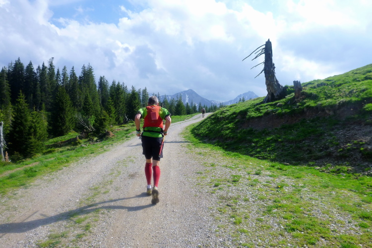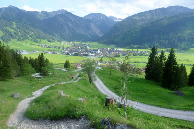 In Richtung Älpele, einer auf 1.529 m liegenden Alm – gestartet sind wir auf 1.097 m – geht’s auf einem gut zu belaufenden Schotterweg weiter. Mich beschleicht der leise Verdacht, daß das nicht so bleiben wird. Stetig führt der Weg bergan, meine Preisklasse ist schon längst demütig am Marschieren. Der Untergrund wird anspruchsvoller, ist für mich aber nach wie vor gut zu bewältigen. Dann öffnet sich plötzlich der Wald, eine Lichtung erscheint und ganz kurz habe ich ein Déjà-vu vom Karwendellauf, denn vor meinem geistigen Auge erscheint der Große Ahornboden. Es folgen weitere Schotter- und Waldwege, erste Trampelpfade erfreuen das Trailerherz. Wir unterqueren eine Seilbahn, wunderbar liegt Tannheim unter uns im schönen Tal. Anstrengende Aufstiege auf schmalem Pfad sind zu nehmen, so lieben wir das, bald 300 m höher.