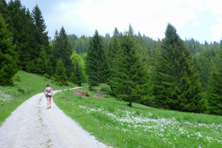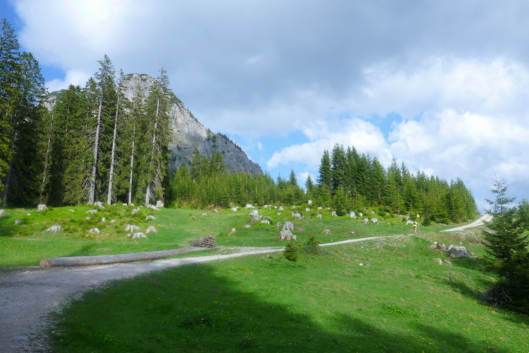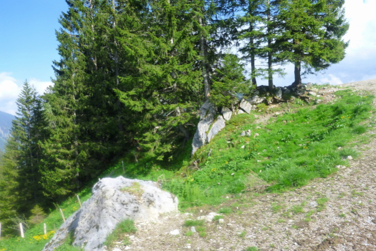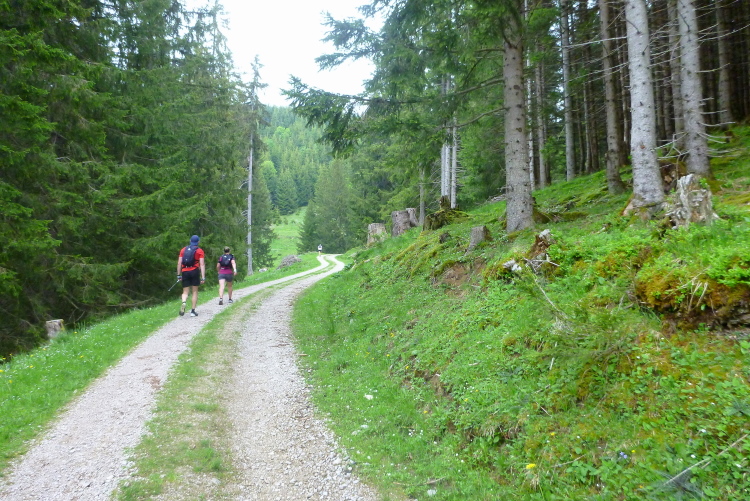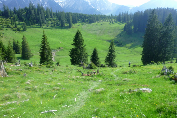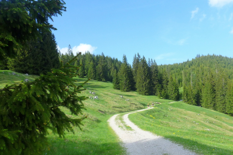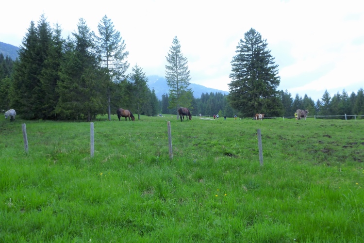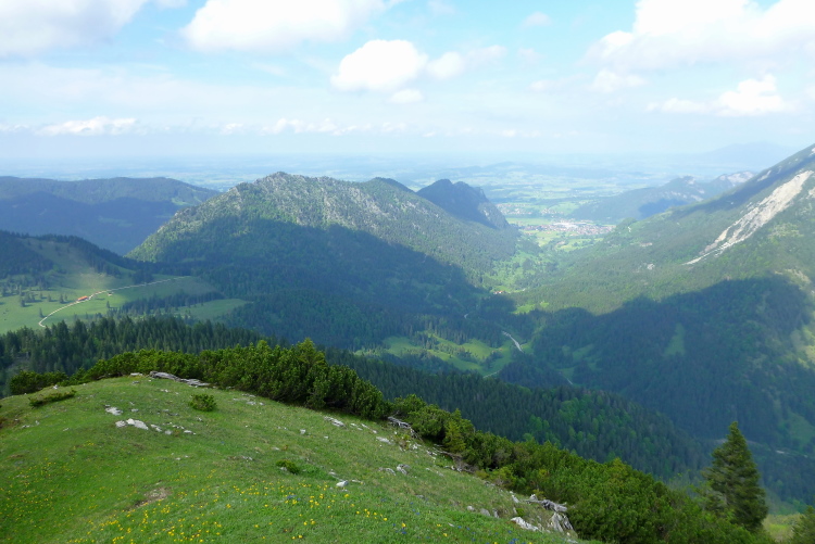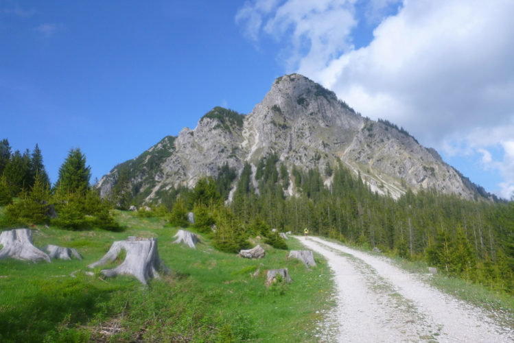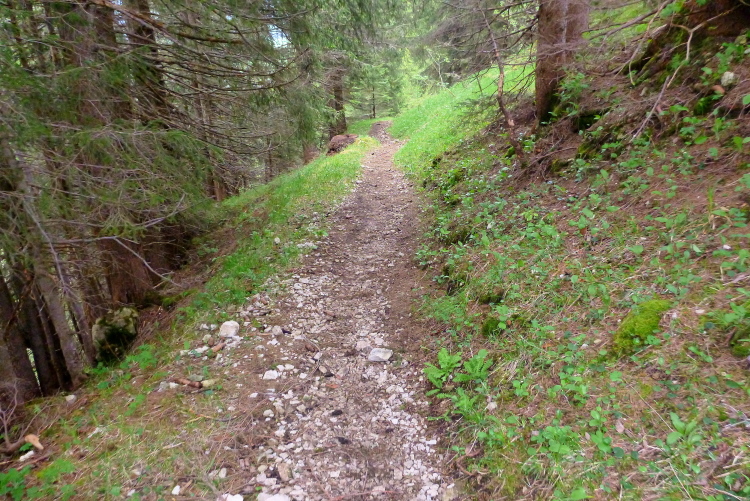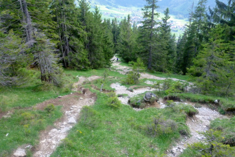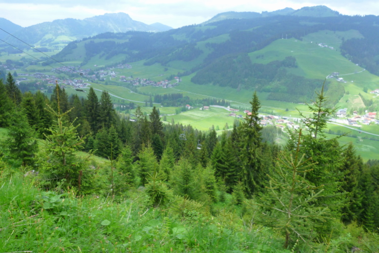 In Richtung Älpele, einer auf 1.529 m liegenden Alm – gestartet sind wir auf 1.097 m – geht’s auf einem gut zu belaufenden Schotterweg weiter. Mich beschleicht der leise Verdacht, daß das nicht so bleiben wird. Stetig führt der Weg bergan, meine Preisklasse ist schon längst demütig am Marschieren. Der Untergrund wird anspruchsvoller, ist für mich aber nach wie vor gut zu bewältigen. Dann öffnet sich plötzlich der Wald, eine Lichtung erscheint und ganz kurz habe ich ein Déjà-vu vom Karwendellauf, denn vor meinem geistigen Auge erscheint der Große Ahornboden. Es folgen weitere Schotter- und Waldwege, erste Trampelpfade erfreuen das Trailerherz. Wir unterqueren eine Seilbahn, wunderbar liegt Tannheim unter uns im schönen Tal. Anstrengende Aufstiege auf schmalem Pfad sind zu nehmen, so lieben wir das, bald 300 m höher.