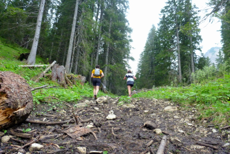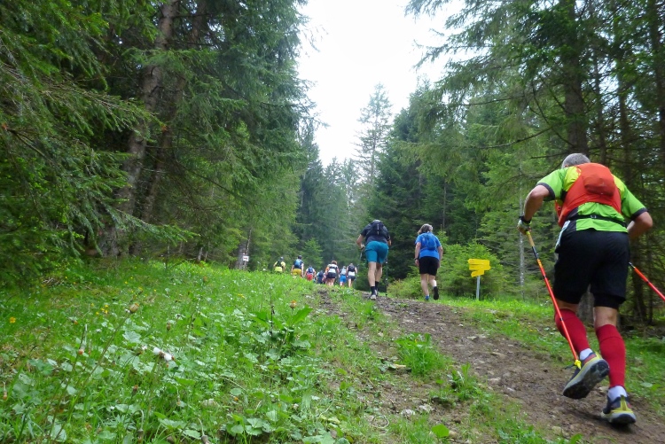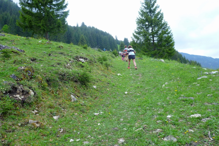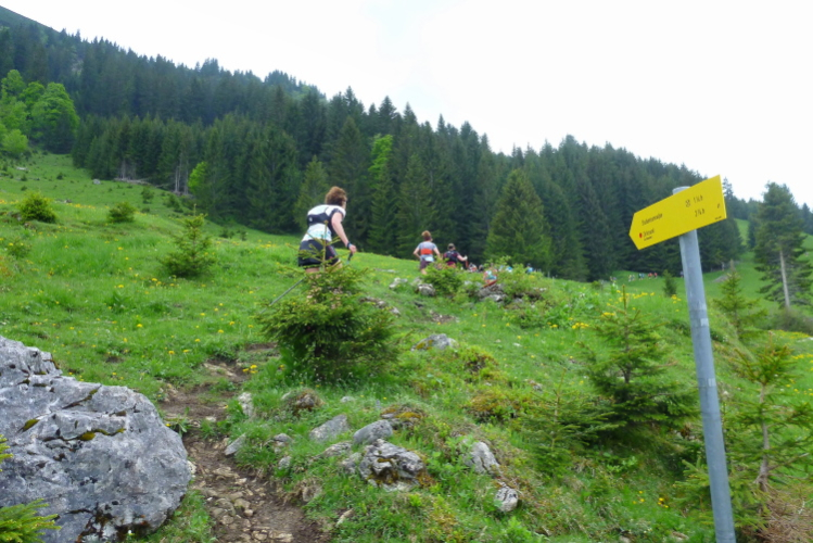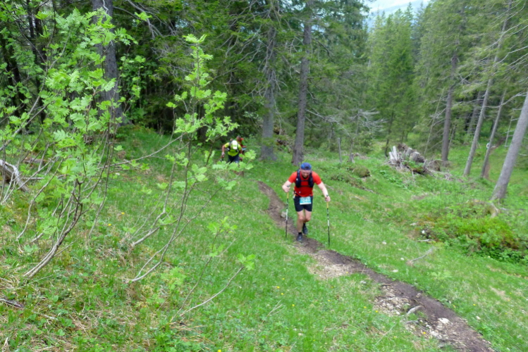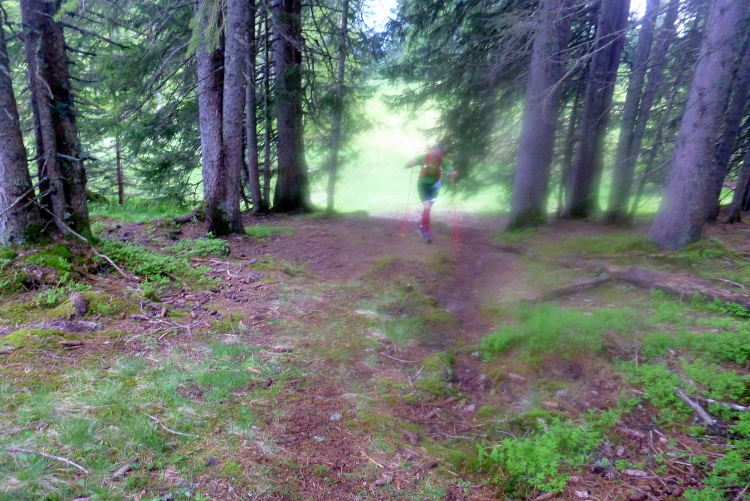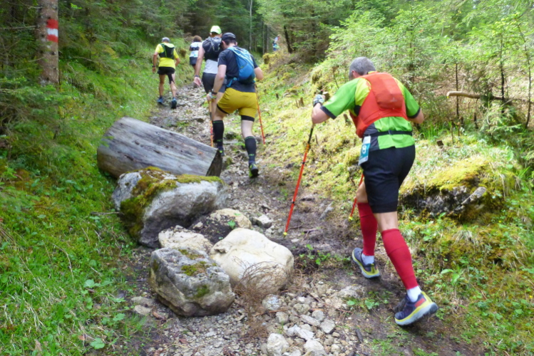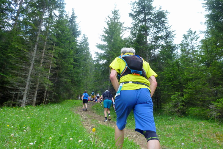 Auf wilden Serpentinen, tief ausgewaschen, steindurchsetzt, werde ich hinabgeleitet. Es fällt mir wirklich schwer mir vorzustellen, wie man diesen Lauf (und es funktioniert offensichtlich!) in gut zweieinhalb Stunden schaffen kann. Die müssen hier auf der Diretissima heruntergeflogen sein. Vater hingegen eiert herab, obwohl es für mich immer noch Laufen ist. Klar, das ist ein Lauf der Spezialisten, der ich nicht bin. Zudem bin ich ein alter Sack, fortgeschritten in der M60, der höchsten Altersklasse. Bei den Mädels ist bereits in der M50 Schicht im Schacht. Trotzdem bin ich in der Lage, noch halbwegs mitzuhalten. Geil! Herrlich ist das Trailer-Dasein! Aber der Weg hinab ist echt schwierig, leck mich enne Täsch! Doch die Erlösung naht.