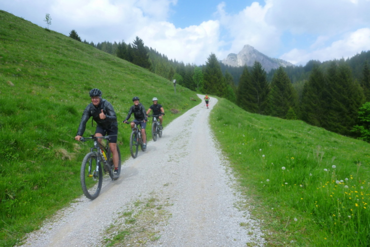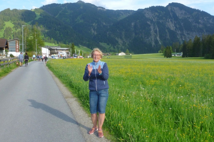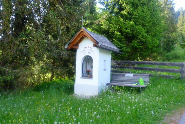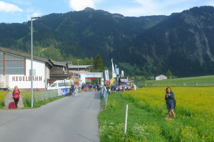 Günther und ich sind mit lt. Ansager rund 150 Gleichgesinnten um 14 Uhr die Ersten, die ausziehen, das Tannheimer Tal zu erobern. Die 22,7 km werden um 15 Uhr, der Zehner um 15:10 Uhr gestartet. Der pflichtbewußte Reporter schießt noch ein Startbild und reiht sich anschließend ganz am Ende, noch hinter dem verdutzten Schlußradler, ein. An der Tennishalle vorbei und um die Tennisplätze herum verlassen wir das idyllische 1.000-Seelen-Örtchen. Durch hohe Blumenwiesen geht’s gleich bergauf. Zur Rechten steht seit 120 Jahren die markante Lourdes-Kapelle mit Mariengrotte und Kreuzweg die wir natürlich vorher längst inspiziert haben. Bergab führt unser Weg zurück an den Dorfrand, die ersten Höhenmeter sind im Sack. Viele weitere und längst nicht so bequeme werden folgen.