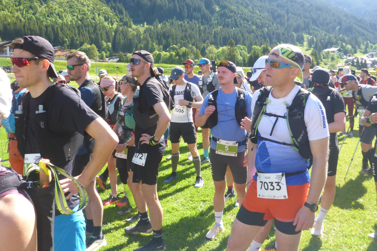 Die ersten, die heute an den Start gehen, sind um 10 Uhr die knapp 200 Läuferinnen und Läufer auf dem 6-Hütten-Trail. Vor dem Startbogen wird uns vor den Bergmassiven die Streckenführung recht anschaulich vom Rennleiter erklärt. Ja, da geht’s ganz schön hoch und dazu wird es noch sehr warm werden. Heute gibt es nur tiefblauem Himmel und es sind auch keine Störungen zu erwarten. Mit den Höllenglocken von AC/DC werden wir pünktlich in den Aufstieg geschickt. So muss ich es ausdrücken, denn bereits vom Start weg, geht es leicht aufwärts. Somit entfällt für mich ein erstmal lockeres Einlaufen.
