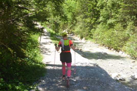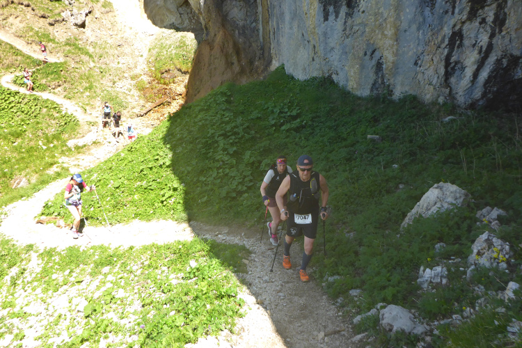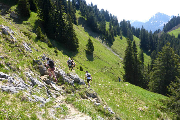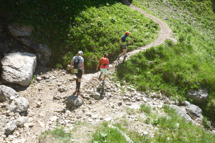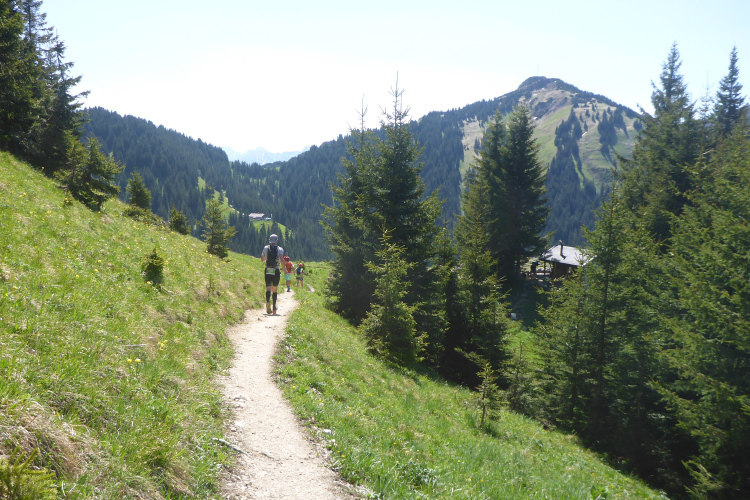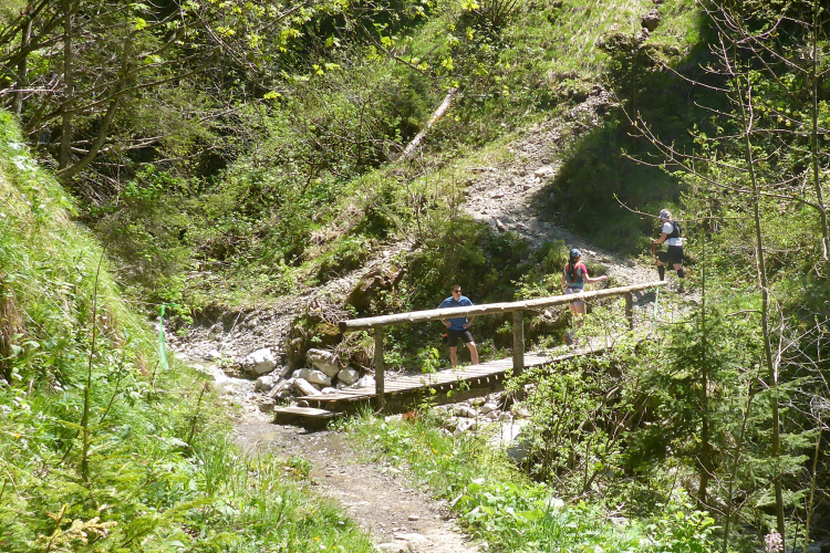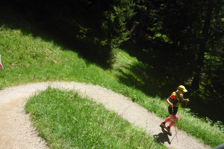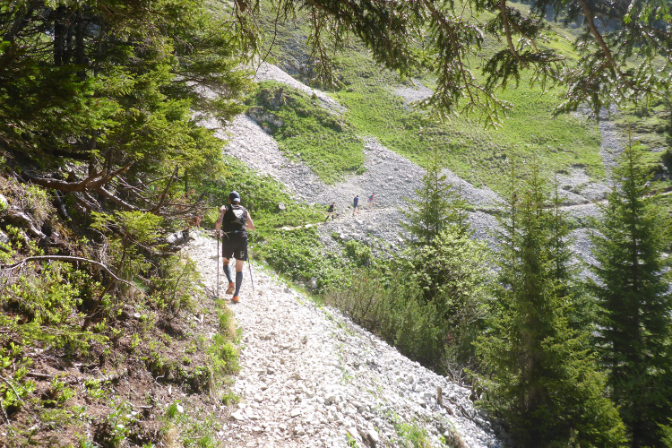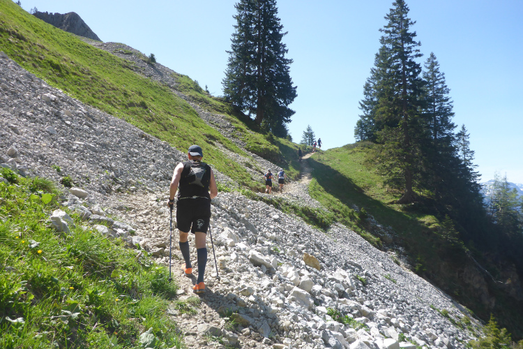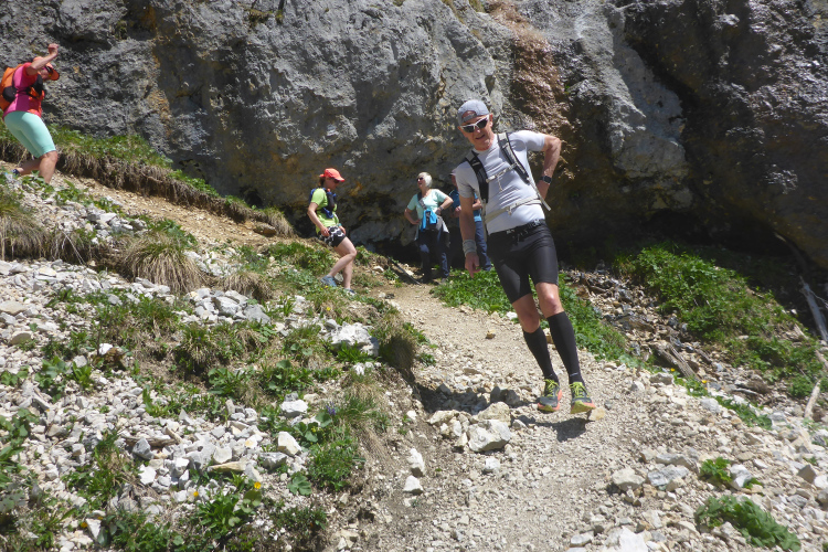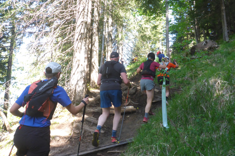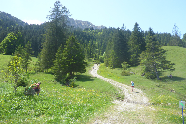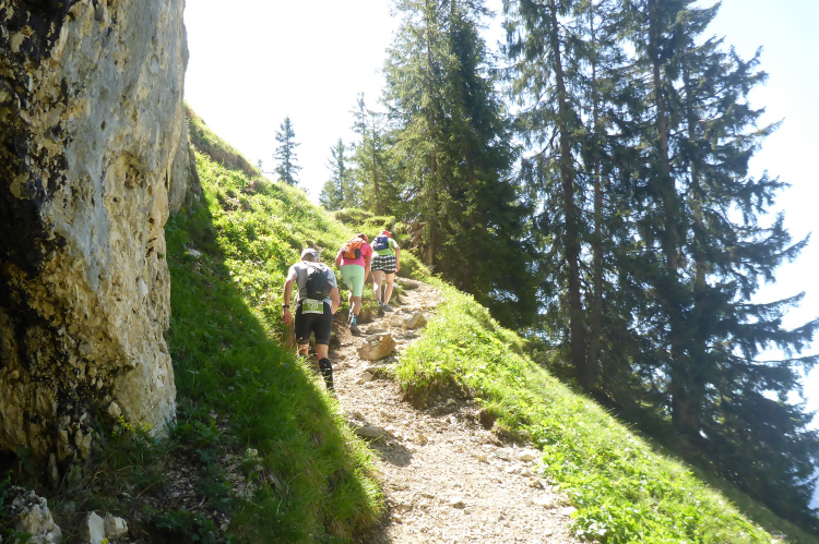 Auf schmalen Sträßchen und Wegen werden wir an das erste Massiv herangeführt. Nach gut einem Kilometer geht es zwischendrin dann aber doch noch für einige hundert Meter leicht abwärts, wo ich besser in einen Laufschritt finde. Eine mit vielen Personen flankierte Spitzkehre schickt uns nach 2,5 km auf einen Serpentinensteig und tief in den Wald. Mit vielen Windungen und oft mit Treppenstufen verstärkt, steigen wir auf bis zum Gimpelhaus, das auf einer kleinen, sonnigen Ebene liegt. Erst kurz unterhalb verlassen wir den dichten Wald und es wird steiniger mit einigen ausgesetzten Stellen auf den letzten Metern.