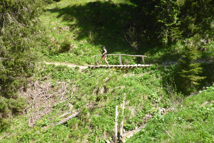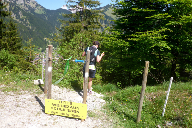 Gut gestärkt geht es weiter bergab. Abwechslungsreich, garniert mit anspruchsvollen Single-Trails, beinhaltet der Downhill weitere 540 negative Höhenmeter. Die sind eigentlich meist recht gut zu laufen, fordern dafür aber auch anständig die Oberschenkel. Erst in Sichtweite von Nesselwängle wird es wieder flacher und mitunter auch kurz eben oder leicht ansteigend. Etwas oberhalb des Ortsrandes ziehen wir entlang bis zum Zielgelände.