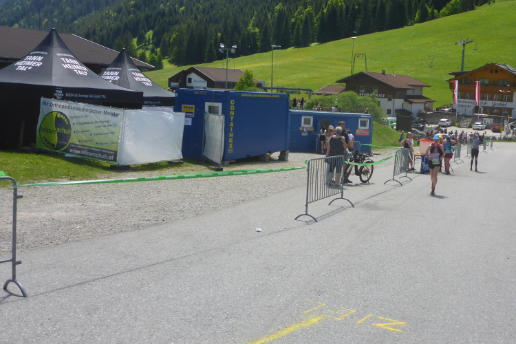 Das Gimpelhaus liegt auf einer Höhe von 1.659 m, wir haben hier 4,1 km auf der Uhr und auch schon über 500 Höhenmeter abgearbeitet. Direkt daneben ist die erste Getränkestation für uns errichtet. Viele wollen bereits Wasser über den Kopf, dem Wunsch kommen die Helfer gerne nach. Iso und Cola werden auch angeboten.