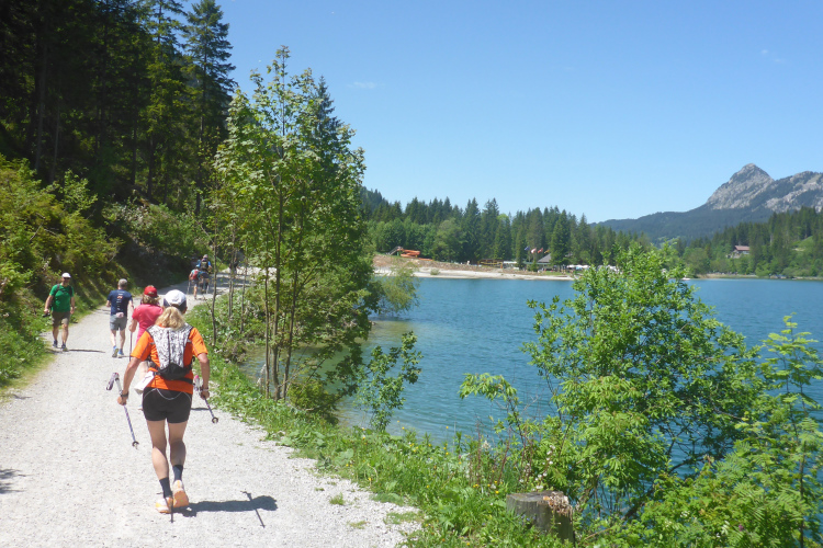 Nach 14 km wechseln wir die Talseite, wo es auch gleich kräftig nach oben geht. Auf den ersten Aufstiegsmetern kann ich vom Zielsprecher den Start des Seen-Laufs über 10 km vernehmen und auch das Läuferfeld von oben ganz gut beobachten. Der Anstieg ist mit etwa 100 Höhenmetern noch nicht allzu lang und führt uns an den Haldensee. Nach etwa einem Kilometer liegt er Türkisblau unter uns in Sichtweite. In Serpentinen führt uns ein Pfad hinunter ans Seeufer, wo ich jetzt auch direkt auf Teilnehmerinnen und Teilnehmer am Seen-Lauf treffe. Es sind die Nordic Walkerinnen und Walker, die über 8 km unterwegs sind und zeitgleich mit der 10 km Distanz an den Start gingen. Ich versuche möglichst schnell vorbeizukommen, aber es gelingt mir nicht mehr so dynamisch wie ich es mir eigentlich vorgestellt hätte, ich bin doch schon ziemlich platt.