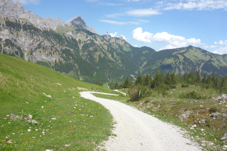 Kurzzeitig ziehen gerade ein paar Wolken durch und etwas Wind pfeift mir um die Ohren, was für spürbare Abkühlung sorgt. Einen Kilometer weiter und etwas tiefer gelegen, können wir uns neben der Edenalpe Nesselwängle mit Getränken versorgen und auch Energy-Gels liegen noch bereit.