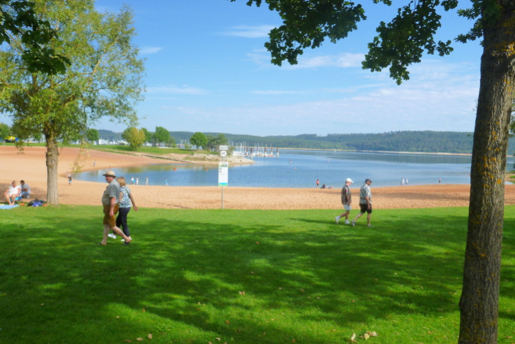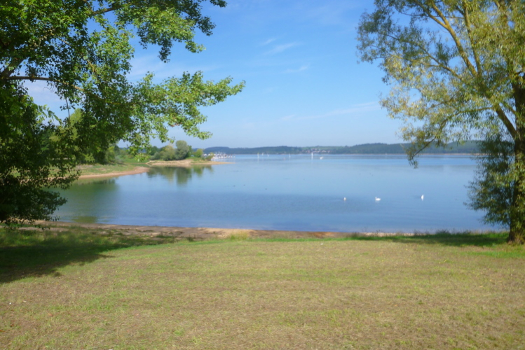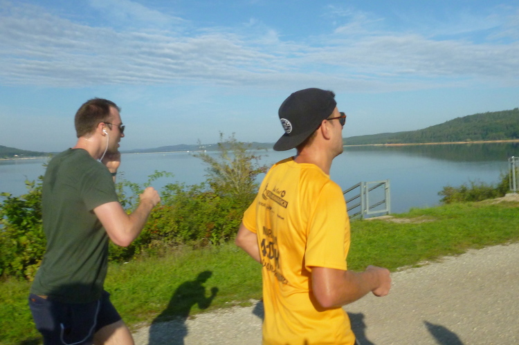 Feinster Asphalt sorgen bei mir für etwas höheres Tempo, ich gehe an dem Pacer vorbei. Unten im Wasser ziehen schon erste Ruderer ihre Bahn. 1,7 Kilometer lang ist der Hauptdamm, der 56 Millionen Kubikmeter Wasser aufstaut. Wir wissen, dass diese Region für den Großraum Nürnberg ein wichtiges Naherholungsgebiet darstellt. Wassersport wie Segeln und Surfen kann man hier betreiben und heute vielleicht auch noch Schwimmen.