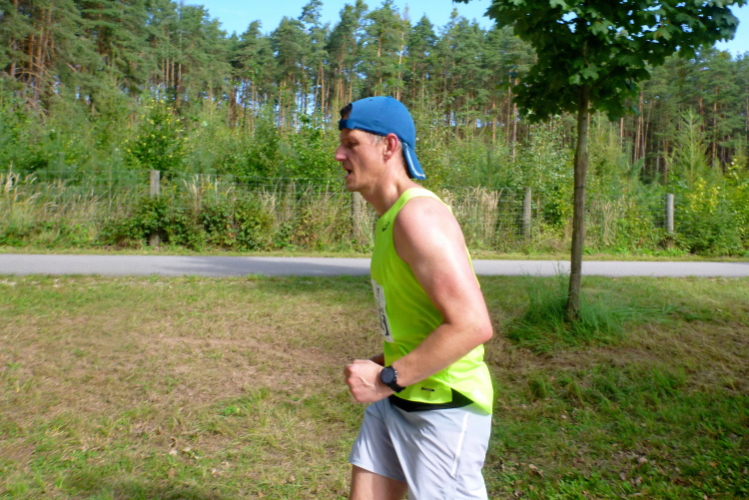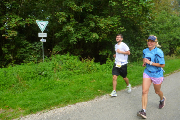 Nach der Tränke sollten wir das Tempo reduzieren, denn es warten einige Höhenmeter (Kilometer 16 bis 17) auf unserem Kurs. Danach bekommen wir wieder die Höhenmeter zurück und der 18. Kilometer ist bei mir sogar der Schnellste mit 5.18 Minuten. Max muss schließlich abreißen lassen, das ist für ihn zu schnell . Vielleicht kann er den alten Hasen wieder schnappen, sollten diesem am Ende die Körner ausgehen.