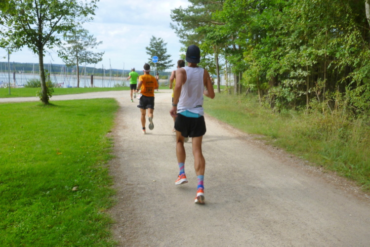 Gleich nach Absberg geht es über die Staumauer, die den Kleinen vom Großen Brombachsee trennt. Der Pacer der vier Stunden ist dicht hinter mir und läuft absolut gleichmäßig. Gut elf Kilometer, ein Viertel des Marathons, liegen hinter uns. Ich fühle mich gut, aber ich merke, dass die Temperatur bereits deutlich gestiegen ist. Wenigstens liegen immer wieder Teile des Kurses im Schatten.