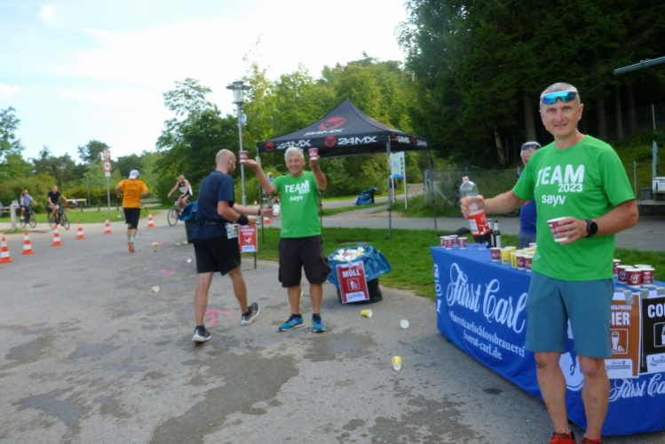 Kilometer neun. Ich erreiche zusammen mit Max, den ich gerade kennenlernen durfte, den Hafen von Enderndorf. Schnell sind die paar Kilometer vergangen, wir haben uns ausgetauscht, welche Pläne wir für dieses Jahr noch haben und dass für uns beide der Metropolmarathon 2024 ein „Must Be“ sein wird, denn der Lauf wird die Städte Färddh und Nämberch verbinden. Die DJs Frederik & Heiko unterhalten Aktive und Zuschauer aufs Beste. Seit geraumer Zeit überholen uns die Staffeln, die mit einem Zeitversatz von 20 Minuten gestartet sind. Ich bin erstaunt, wie „laut“ die Schnellen vorbeirennen und frage mich, ob es an den Carbon-Schuhen legen kann?