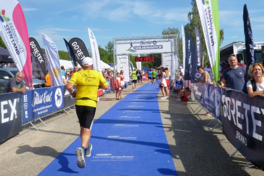 Die letzte Steigung wartet, etwa 600, 700 Meter lang, und abermals muss ich marschieren. „Der Schmerz vergeht, der Stolz bleibt“ - alter Spruch, aber wahr. Ich trabe wieder an. Gleich danach beginnt der letzten Kilometer, der uns hinunter führt und dann aus dem Wald heraus. Dort warten ein paar Mädels mit aufmunternden, aber nicht jugendfreien Sprüchen („du geile Sau“). Ein paar Meter muss ich noch gehenderweise ausschnaufen, dann trabe ich zuerst auf der Landstraße, dann auf dem Festplatz hin zum Zieltransparent auf blauem Teppich. Jeder wird angekündigt, Feierabend, 4.18 Stunden zeigt die Uhr, erledigt ist der Marathon und der Läufer. In Anbetracht der Sommerwärme eine gute Zeit. Im Ziel wird mir eine Medaille umgehängt. Der Punkt für Nachhaltigkeit geht an den Veranstalter, die Medaille ist nämlich aus Holz.