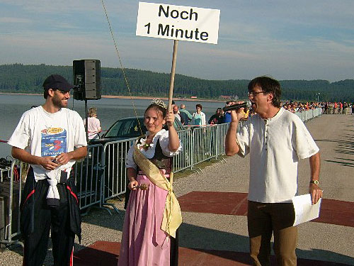 Dort am Hauptdamm des Großen Brombachsees gesellt sich der Klaus Duwe zu uns. Ja, der Klaus vollendet auch seinen Doppeldecker, nur dass er am gestrigen Tag beim Drei-Talsperren-Marathon in Eibenstock unterwegs war. Dort waren für ihn wohl ein paar Höhenmeter mehr zu erklimmen als für mich am Bodensee.