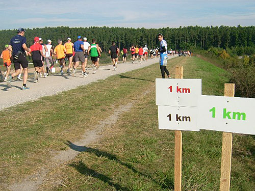 Ein paar Kilometer weiter sehe ich dann den Besenwagen in Gestalt eines Radfahrers, der die letzte Läuferin vor sich her treibt. So schlimm ist’s doch nicht, denn die Frau läuft gleichmäßig und wird das Ziel sicher erreichen. Die zweite Runde geht schnell zu Ende und ich überquere den Hauptdamm zum dritten Mal.