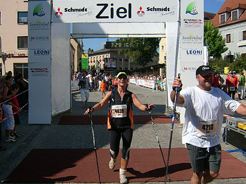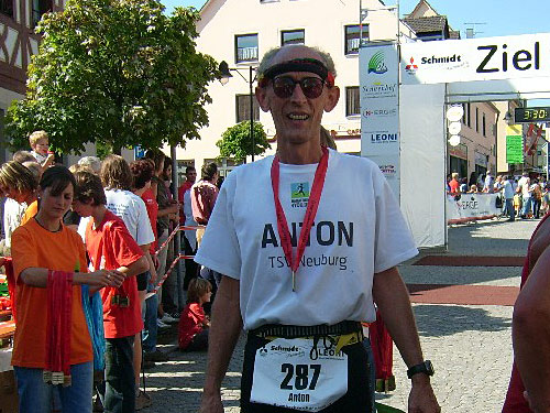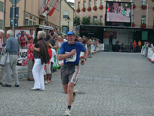 Dann laufe ich durch das Spalter Tor und werde dann namentlich von Peter Maisenbacher angekündigt. Der Peter weist auch in seiner kundigen Ansprache nochmals auf das Laufportal marathon4you hin. Ja, und beim Durchlaufen des Zieles auf dem Marktplatz sehe ich eine 3.29 Stunden. Ich erhalte eine Medaille umgehängt. Und da plärrt schon eine bekannte Stimme. Es ist meine Arbeitskollegin Gertrude, die mich mit einer Bottle Bier anlockt.