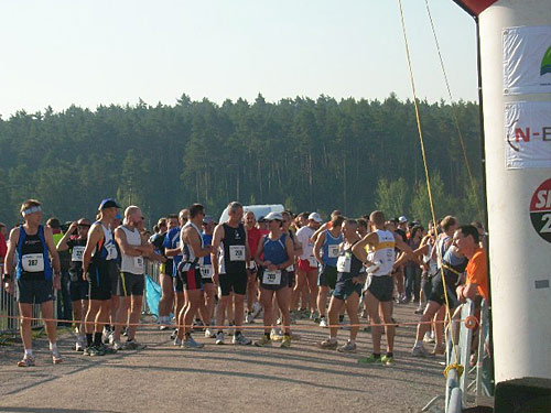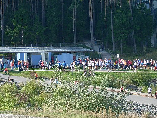 Unsere Startunterlagen bekomme ich zügig von den freundlichen Helfern überreicht. Neben einem dicken Programmheft, Stoffbeutel und Schwamm erhalten die Läufer wahlweise ein Käppi oder ein T-Shirt. Für ein funktionelles Shirt müssen ein paar Euro draufgelegt werden. Ja, und der Gutschein für die Nudeln hängt an der Startnummer und der kann auch noch nach dem Rennen genutzt werden. Wir sitzen noch ein Weilchen vor der Halle in der bereits angenehmen Sonnenwärme und besteigen dann den Bus, der uns in wenigen Minuten zum Start bringt.