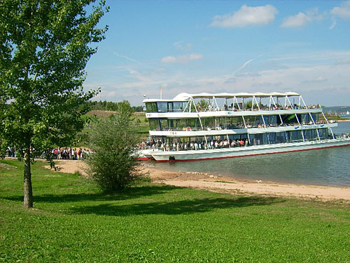 Nach dem Knall führt uns die Strecke nach Norden auf dem Damm des Großen Brombachsees an der Arche vorbei in Richtung Allmannsdorf. Noch auf dem Damm sehe ich nach fünf Minuten Kilometerschilder in verschiedenen Farben. Jeder Sportler, ob Halbmarathoni, NordicWalker oder wir, weiß beim Anblick dieser Schilder seinen Tageskilometerstand. Am Ende des Dammes biegen wir nach links und sofort haben wir bereits wieder mehr Schatten als Sonne.