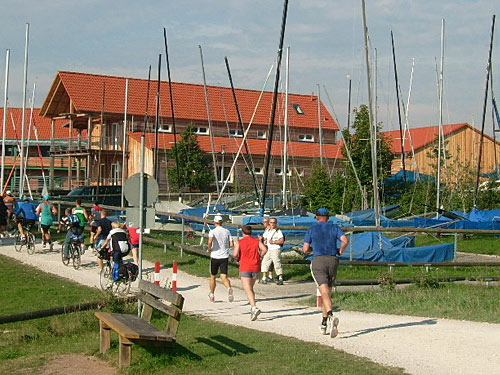Runde um den Großen Brombachsee und Igelsbachsee, zwei Runden um den Kleinen Brombachsee. Zieleinlauf in Pleinfeld.