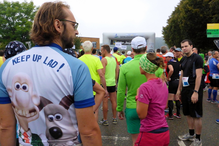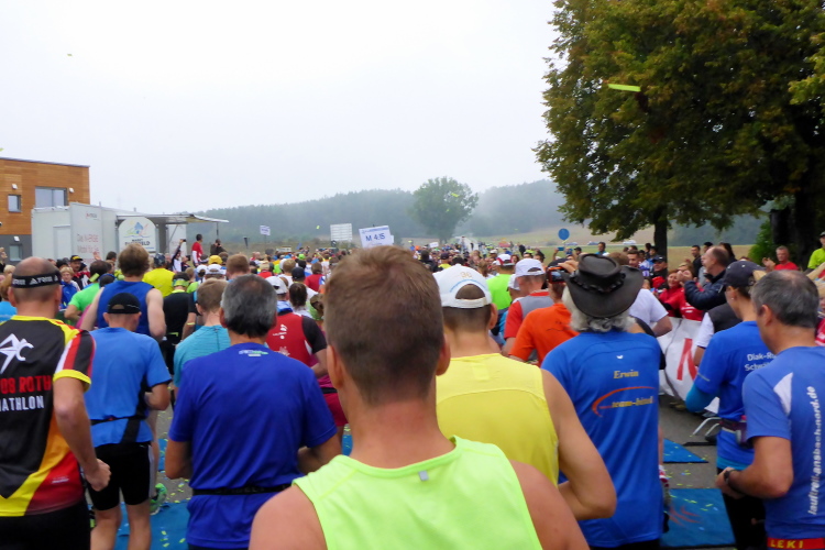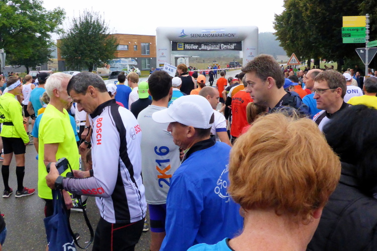 Nach und nach trafen die ersten Marathonis ein und ich entdeckte natürlich wieder zahlreiche bekannte Gesichter. Darunter auch Uli Teichmann, der vom Sprecher auch persönlich vorgestellt wurde. Mit seinen 73 Jahren ist er seit langem Stammgast beim Seenland Marathon und auch regelmäßiger Sieger der Altersklasse M70. Durch die vielen Gespräche verläuft die Zeit bis zum Start wie im Flug. Rund 200 Teilnehmer werden es heute sein. Später kommen noch viele Halbmarathonis und Walker dazu, doch die starten erst zwei Stunden später. Ich hätte mich noch viel länger unterhalten können, doch der Sprecher kündigte den Start an.