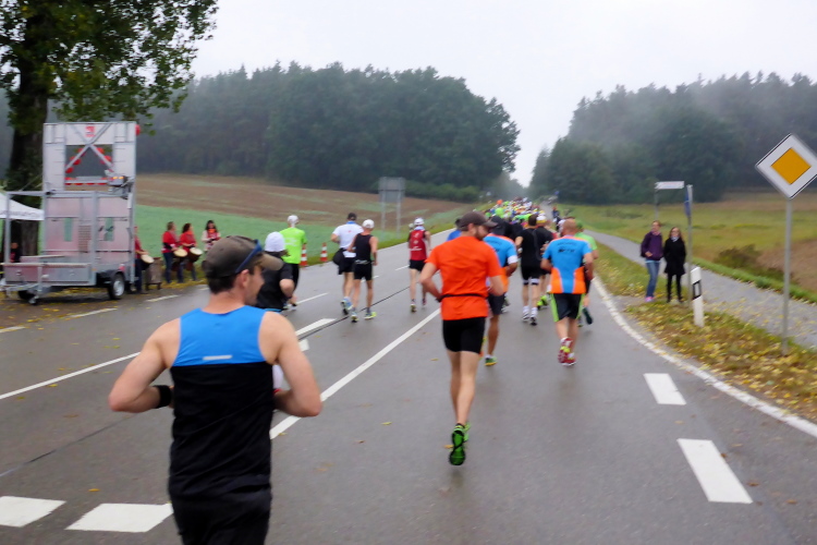 Als nächstes erreiche ich Ramsberg. Hier hat die beeindruckend große MS Brombachsee ihren zweiten Anlegeplatz. Gerade schippert sie los.  Beeindruckend ist auch die Größe des Segelhafens. Er bietet etwa 600 Bootsliegeplätze und ist somit Deutschlands größter Binnensegelhafen. Trotz des Wetters finden sich in Ramsberg verhältnismäßig viele Zuschauer ein, die Stimmung ist prima. Isländische Fußballfans haben es vorgemacht und die Ramsberger Marathonfans machen es lautstark nach.  „Huh, huh“-Rufe,  untermalt von rhythmischem Klatschen in Perfektion. Wir haben nun fast 19 Kilometer zurückgelegt und das Ende der ersten Runde naht.