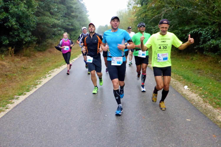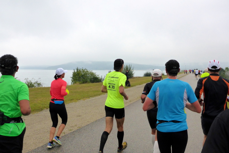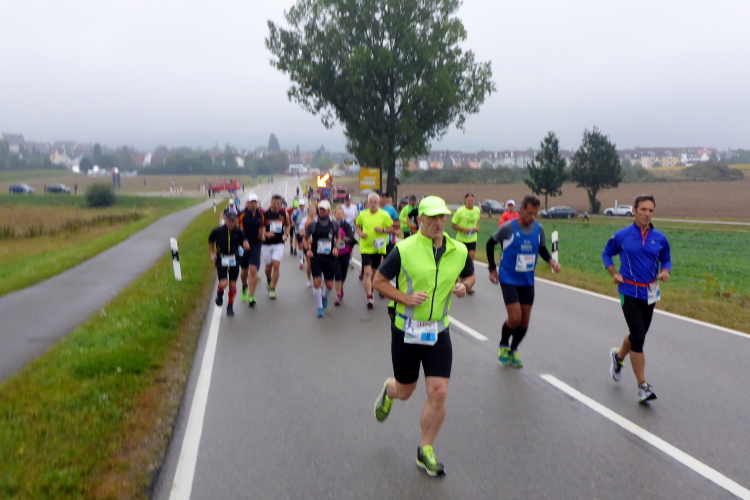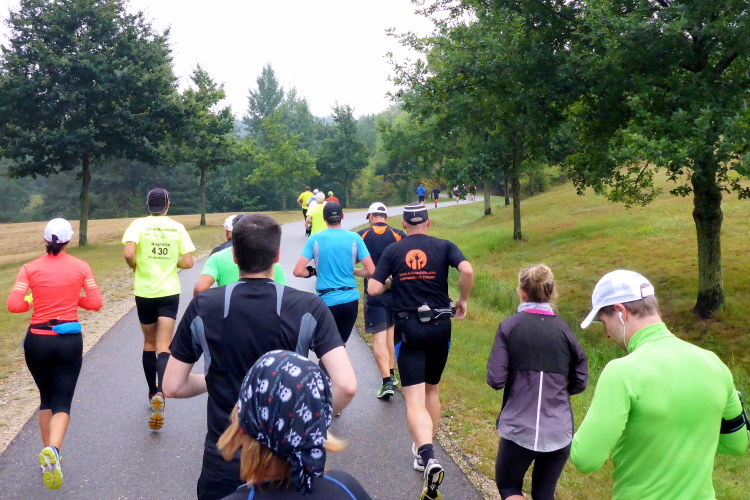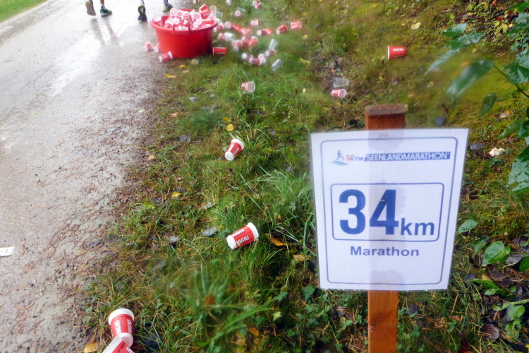 Ich teile mir nun die Strecke mit dem hinteren Feld der Halbmarathonis, die mich an meiner blauen Startnummer als Marathonläufer erkennen und meine Leistung respektvoll anerkennen. Bei Kilometer 30 nach dem Damm zwischen Großen und Kleinem Brombachsee komme ich wieder auf die Pendelstrecke, die für die Halbmarathonis nur 500 Meter lang ist, so dass ich den Anschluss etwas verliere. Ruhiger wird es trotzdem nicht, denn auf den letzten zehn Kilometern sind die schnellsten Walker meine Gegner.