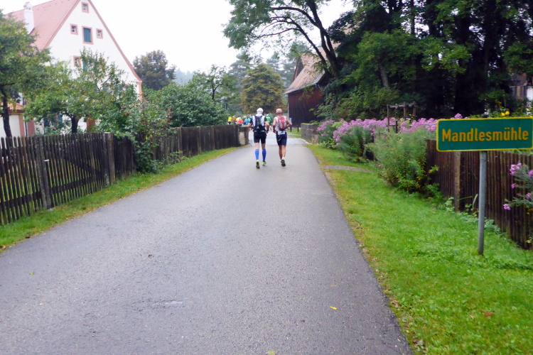 Mit einem lauten Knall und einem Konfettiregen ging es los. Ich war auf die Strecke gespannt, versprach man in der Ausschreibung doch zusätzlich zu den 42 Kilometern noch 420 Höhenmeter. Wie diese zusammen kommen sollen war nicht nur mir ein Rätsel. Gut, nach dem Start auf der Staatsstraße geht es erst mal leicht bergan, aber das ist kaum der Rede wert. Schon nach wenigen hundert Metern zeigt uns ein Straßenschild, dass es gleich nach links weg geht in Richtung Mandlesmühle. Diese haben wir auch bald erreicht. In der Mandlesmühle ist das Infozentrum „Seenland – Wasser für Franken“ eingerichtet. Hier wird die Entwicklung dieses gigantischen Seenbauprojekts auf einer Ausstellungsfläche von 300 Quadratmetern dokumentiert. Für die Besucher werden hier die Beweggründe, die Planung und die Umsetzung einschließlich des heutigen Betriebs des Stauseegebiet anschaulich dargestellt. Klar, dass wir dafür heute keine Zeit haben.