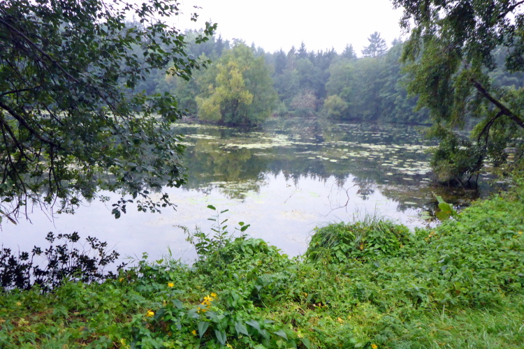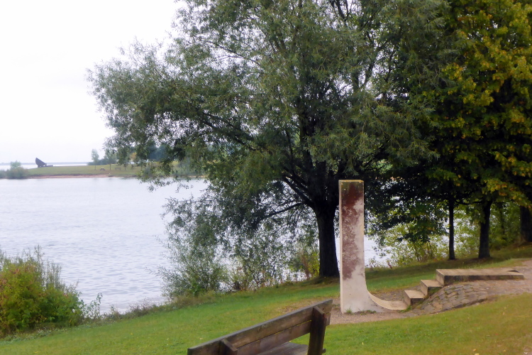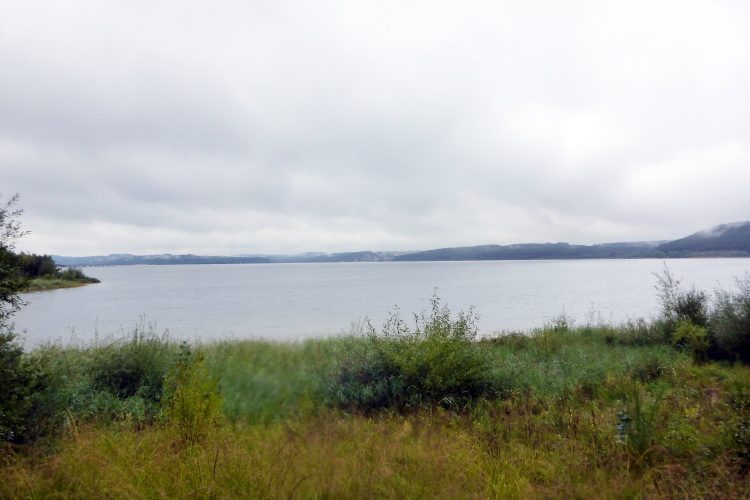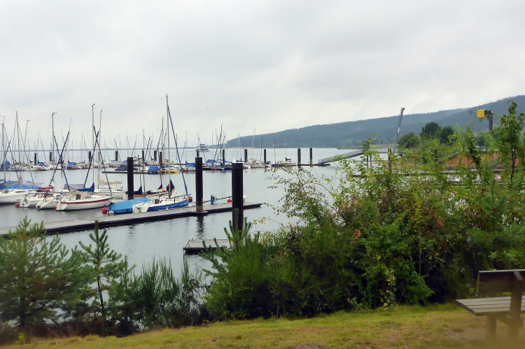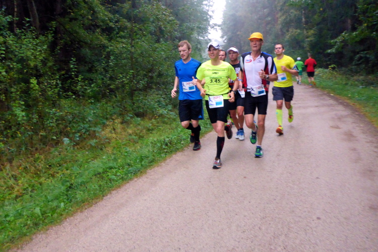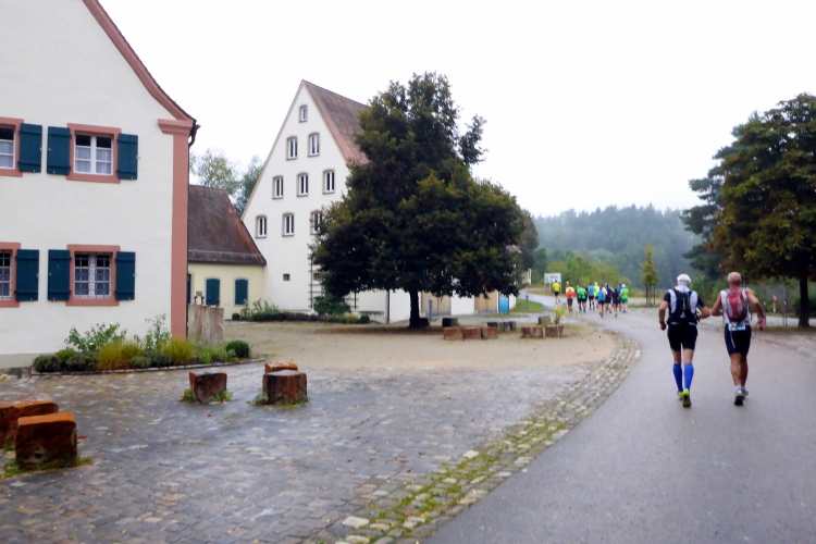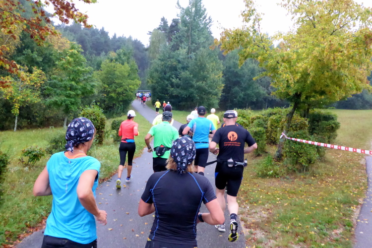 Die nächsten vier Kilometer geht es nun immer am nördlichen Ufer des Großen Brombachsees entlang. Breite und gut befestigte Wanderwege lassen ein entspanntes Laufen zu. Dann treffe ich Manfred, wie schon beim Ermstal Marathon. Wir verstehen uns auf Anhieb und werden von nun an den größten Teil der Strecke gemeinsam laufen. Dass es inzwischen leicht zu nieseln begonnen hat, nehme ich kaum wahr und stört mich auch nicht sonderlich, schließlich war ich ja auf Regen eingestellt. Sollte es beim Nieseln bleiben, wäre alles wunderbar.