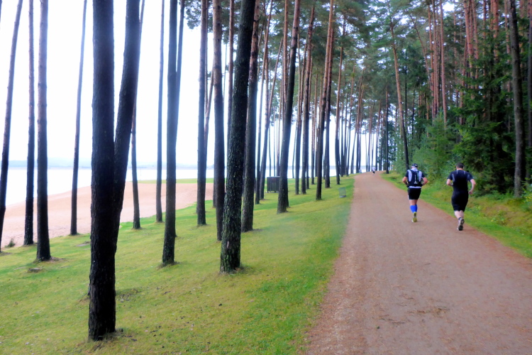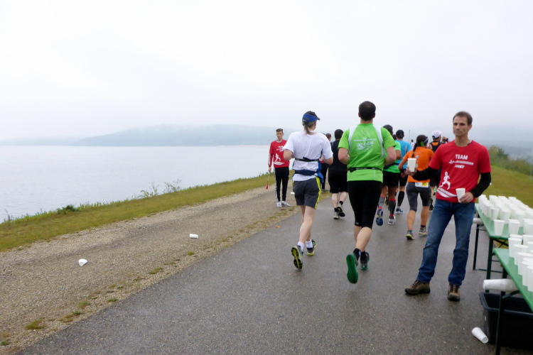Nach der nächsten Verpflegungsstelle bei Kilometer 9 überqueren wir einen weiteren Damm. Dieser ist die Grenze zwischen dem Igelsbachsee und dem Großen Brombachsee. Ein paar Fischer sind auf dem Wasser  in ihren Booten zu erkennen. Sie fischen heute im wahrsten Sinne des Wortes im Trüben. Auch das Ende des Igelsbachsees verschwindet am grauen Horizont. Wir laufen wieder kurz am Ufer des Brombachsees, schon kommt der nächste Damm. Rechts von uns liegt nun der Kleine Brombachsee. Nach dem Ende des Dammes geht es  auf eine Pendelstrecke. Etwa einen Kilometer laufen wir am Ufer des Kleinen Brombachsee entlang, bevor wir wenden. Das ist wie immer recht kurzweilig, da wir so auch den etwas schnelleren Läufern wieder begegnen. Charly und Jan kommen mir kurz nacheinander entgegen und es wird abgeklatscht. Links von uns wird der Wald mit einem hohen Zaun und Stacheldraht abgegrenzt. Dahinter liegt Militärgelände, wie Hinweisschilder verraten. Militärische Aktivitäten kann ich dort jedoch nicht feststellen. Lediglich ein paar Wildschweine suhlen dort im Matsch und lassen sich durch uns Läufer kaum stören.