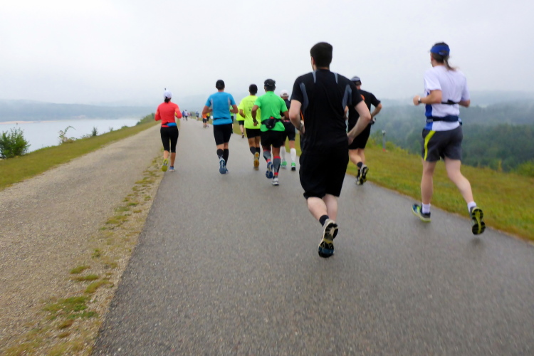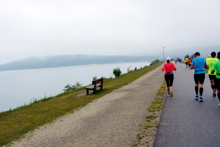 Doch die Ausmaße des Projekts lassen sich schon bald erahnen. Vor uns liegt ein gewaltiger Damm, den es nun zu bewältigen gibt. Schon wieder kommen also ein paar Höhenmeter auf uns zu. Doch der Anstieg hält sich ebenfalls in Grenzen, denn wir laufen den Damm ja nicht direkt hoch. Oben angekommen erreichen wir auch gleich die erste Verpflegungsstation. Danach dürfen wir den Damm in seiner vollen Länge unter die Füße nehmen. 1,7 Kilometer ist er lang. Links von uns liegt nun der Große Brombachsee, der sich heute nicht von seiner schönsten Seite zeigt. Er hebt sich kaum vom grauen Himmel ab und sein Ende lässt sich eigentlich nur erahnen. Schaut man aber nach rechts, hat man eine schöne Aussicht auf das fränkische Seenland.