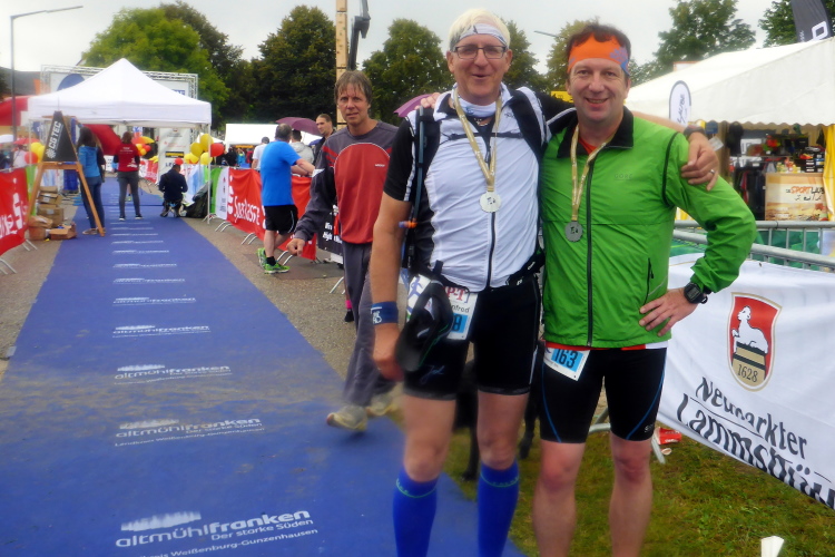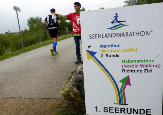 Kurz vor dem Wall biege ich nun statt nach links nach rechts ab und bin auf den letzten zwei Kilometern dieses tollen Marathons. Und was jetzt kommt, macht mir wieder so richtig Spaß. Es geht bis ins Ziel nur noch bergab und ich kann es so richtig fliegen lassen. Ich laufe Slalom durch diverse Walker und freue mich auf das Ziel. Einige Zuschauer an der Strecke erkennen mich als Marathoni und applaudieren mir extra. Das quetscht noch ein paar Sekunden aus mir raus und so biege ich schließlich auf den Volksfestplatz ab und bin im Ziel. Dort treffe ich auch Manfred, dem ich auf den letzten Kilometern nicht mehr folgen konnte. Wir freuen uns, genauso wie alle anderen, über ein geglücktes Finish beim Seenland-Marathon.
