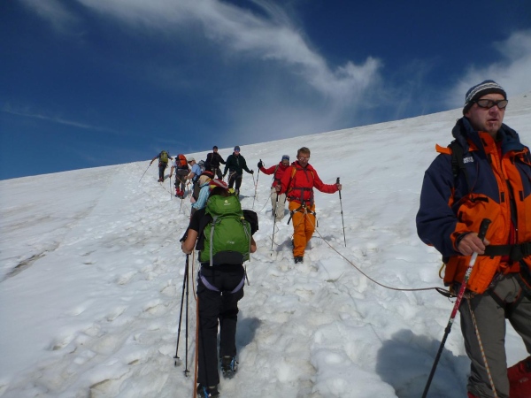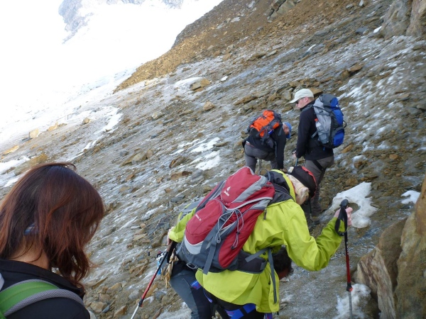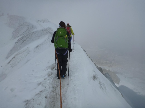 Richtung Rainertörl (3406 Meter), das zwischen Hohem Aderl (3506 Meter) und Rainerhorn (3559 liegt), wird es wieder steiler. Jeder schnauft wie ein Ackergaul, die Höhe und die Anstrengung. Eine andere Seilschaft kommt schon herunter. Am Rainerhorn stauen sich einzelne Wolken. Sie lösen sich dann im Windschatten des Berges nach einer halben Umdrehung ins Nichts auf. Wie im Fernsehen. „Der weiße Buckel da vorne ist der Großvenediger,“ so Stefan. Das Kreuz sieht man noch nicht.