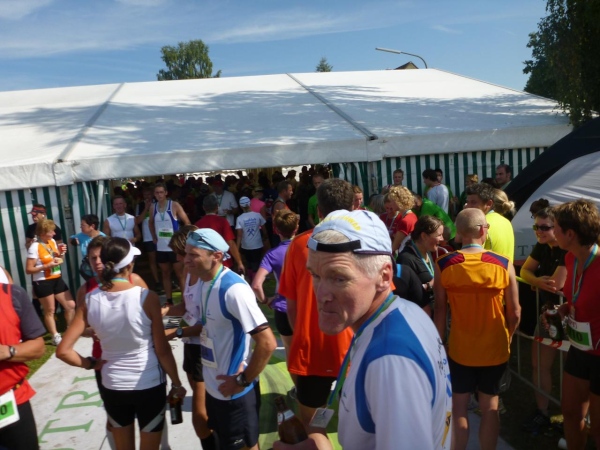 Doch es wird knapp mit einer glatten 4.15. Denn mit brutto rund 4.15.30 Stunden durchlaufen wir das Ziel. Manfred kommt mit 30 Sekunden Rückstand. Jessica lässt sich gerade noch zu einem Bild überreden, dann verschwindet sie im Gewühl des Verpflegungszeltes.