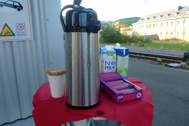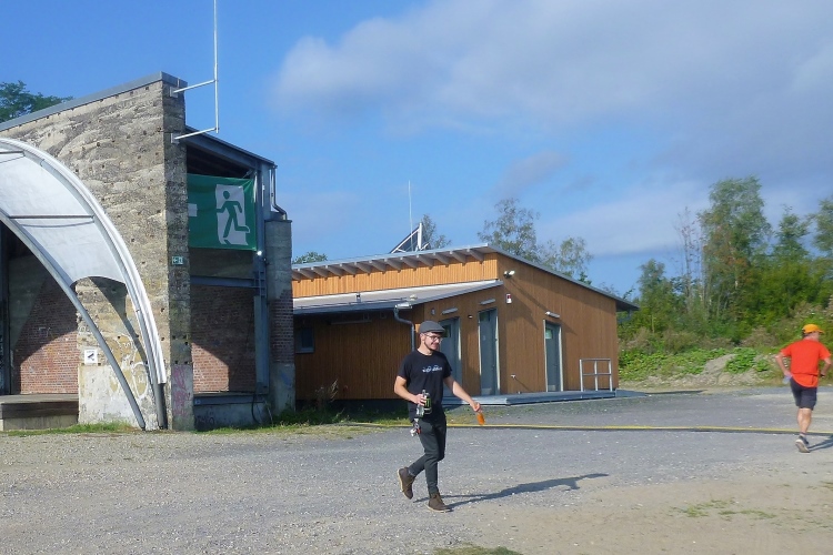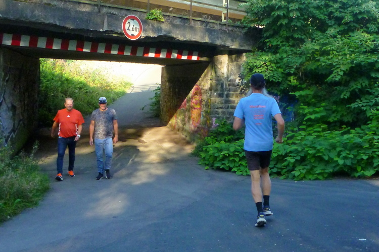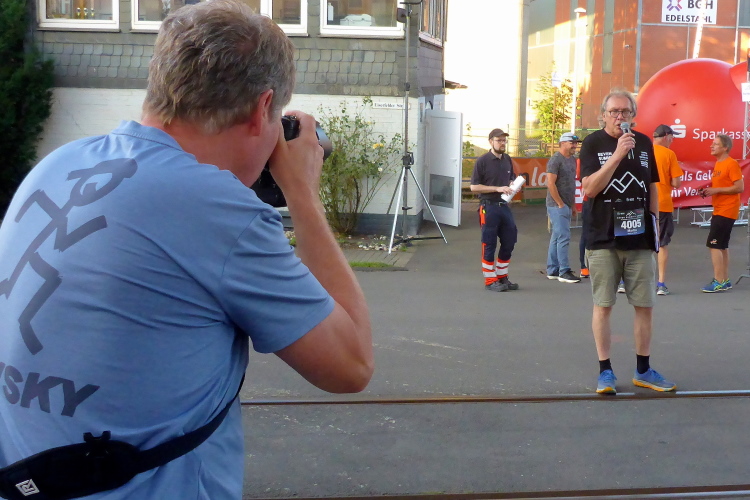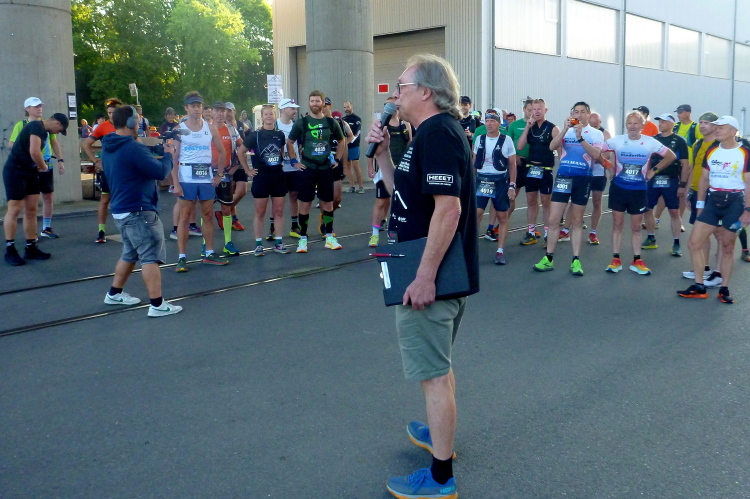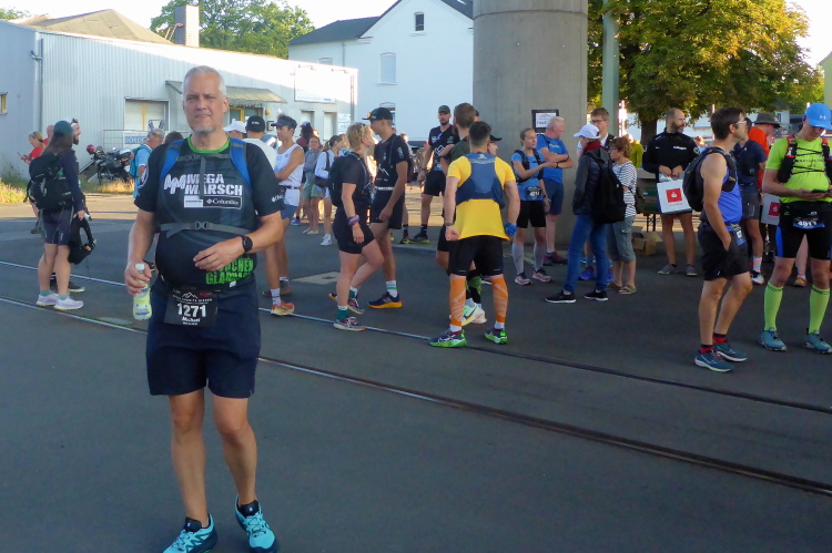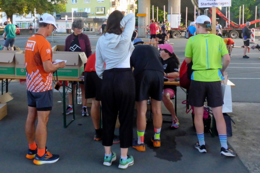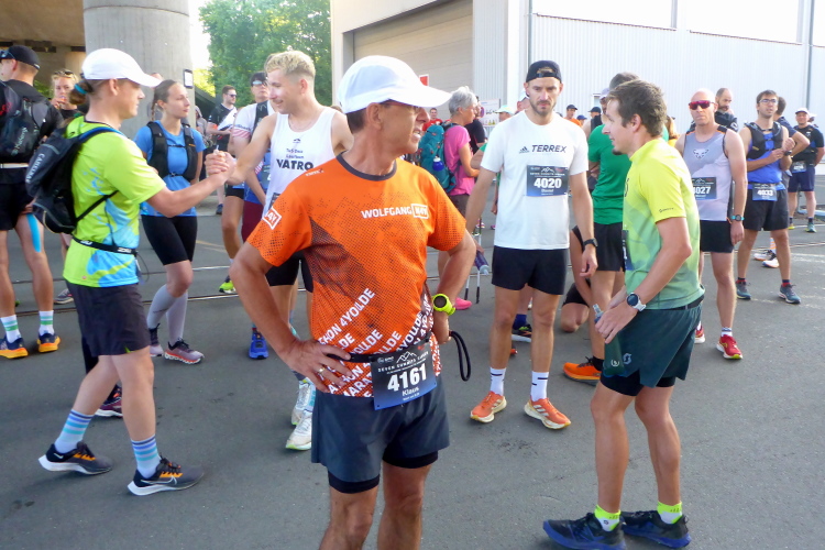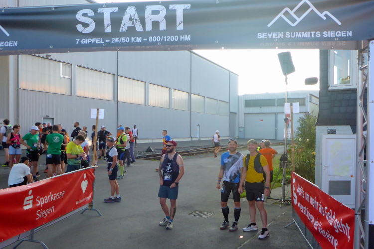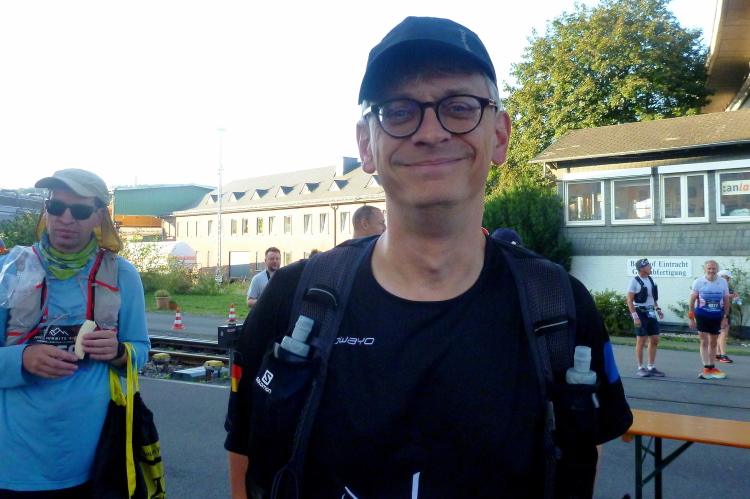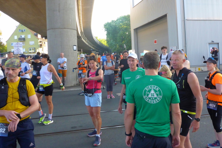 Geparkt wird problemlos an der Siegerlandhalle. Hatte man am Donnerstag und Freitag die Startunterlagen dort noch empfangen können, findet dieses heute kundenfreundlich unmittelbar am Start vor dem ehemaligen Stellwerk der ebenfalls ehemaligen Bahnlinie statt. Fast könnte man von einem kleinen M4Y-Familientreffen sprechen, denn auch Birgit und Norbert Fender, Klaus Klein und Rudo Grimm wollen sich diese Premiere nicht entgehen lassen. Natürlich ist auch Carsten Koczor vor Ort, er hat ein Heimspiel und bringt die Erfahrung aus dem 25 km-Lauf mit. Besonders stolz ist man auf die Teilnahme der Ultralauflegende Birgit Lennartz, die wie ich nur eine überschaubar weite Anreise hatte.