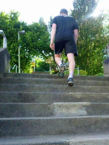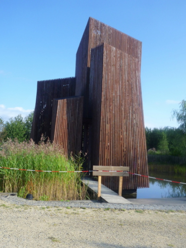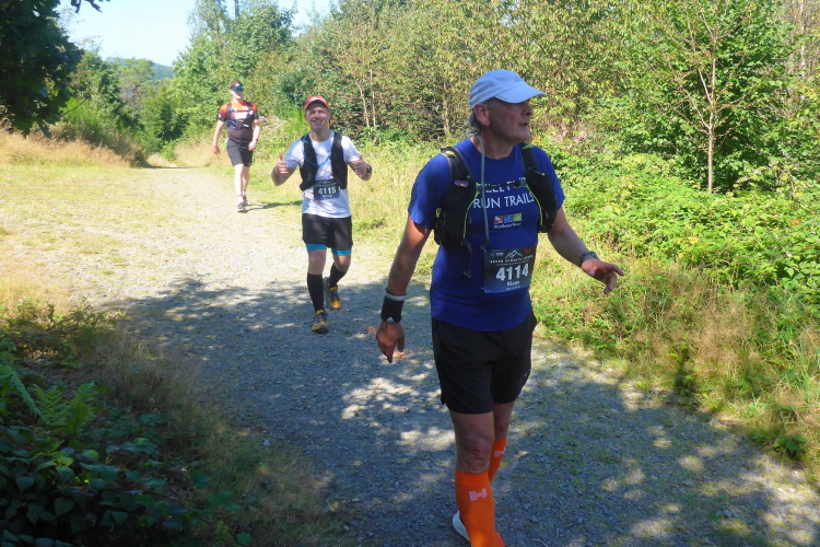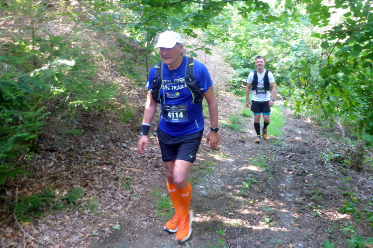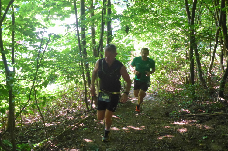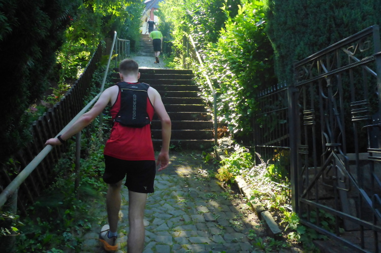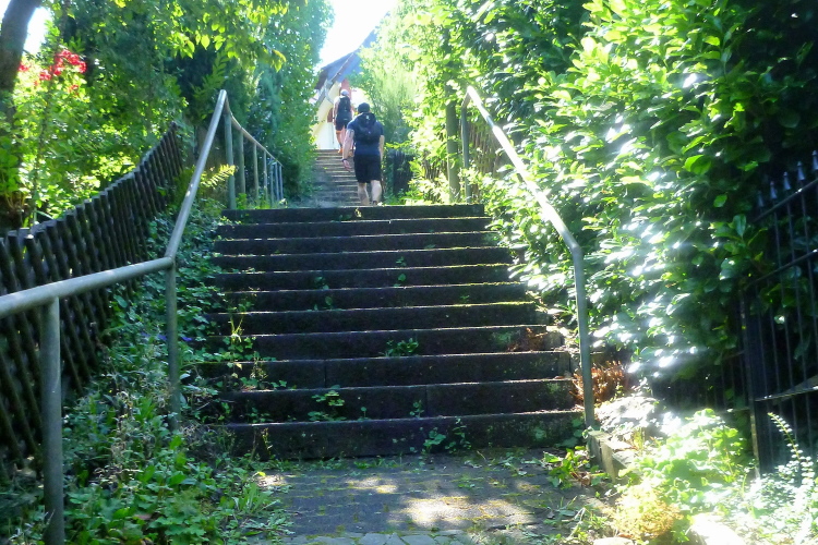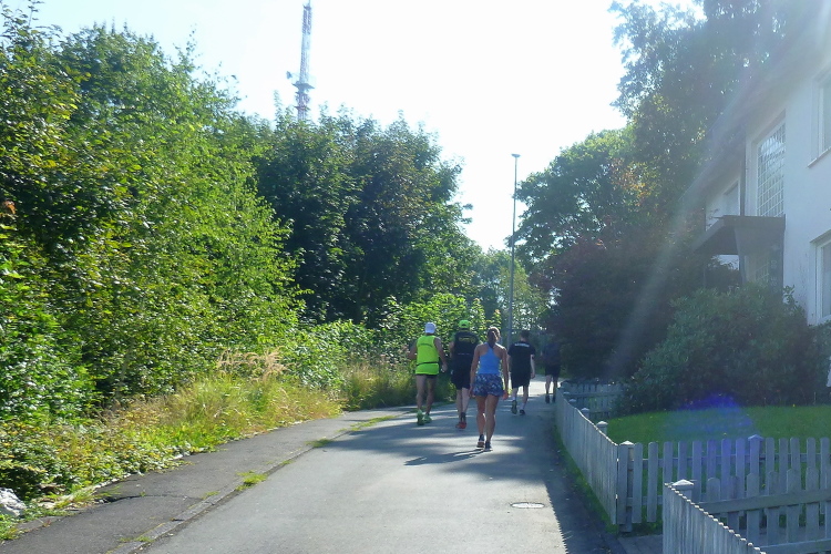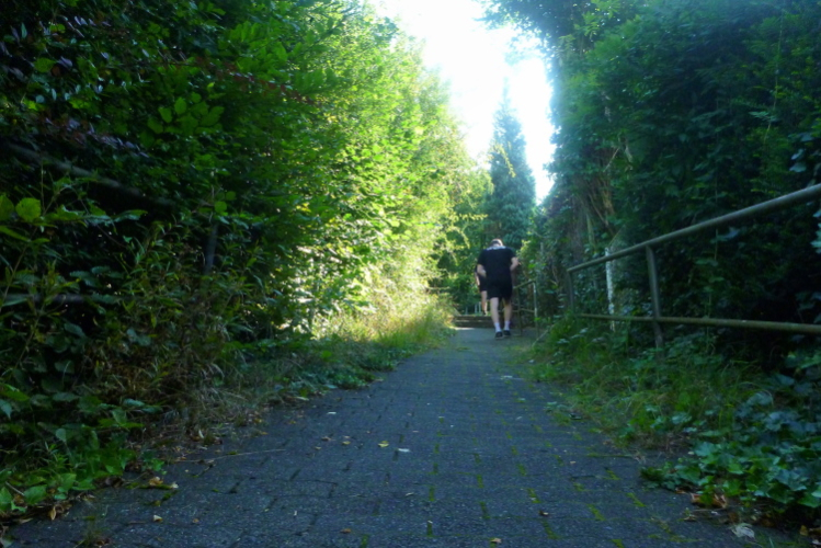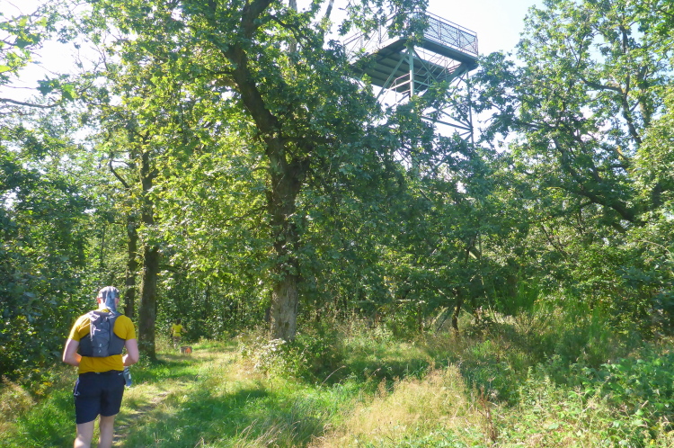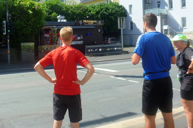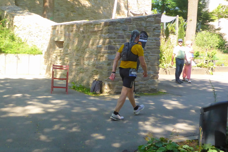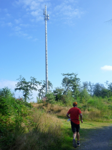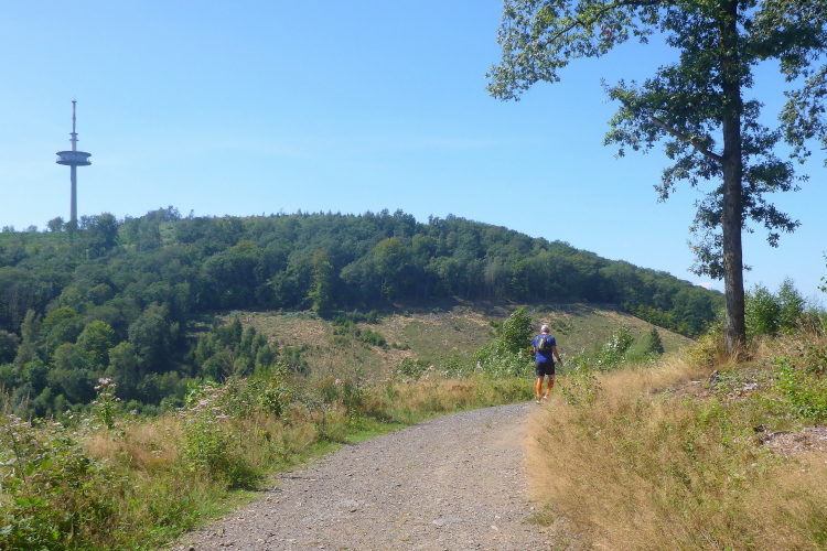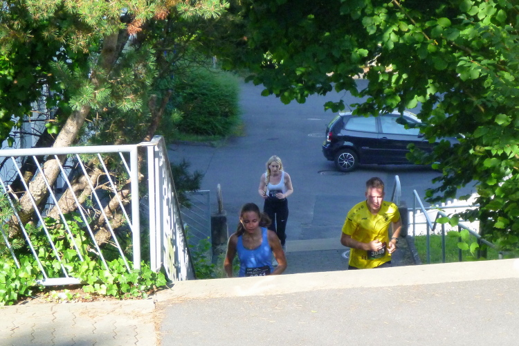Wieder über die Sieg gekommen, stehen wir vor einer längeren Passage durch die Stadt. Ja, Stadt, Land, Fluss, an dieses bewährte Gesellschaftsspiel erinnert der heutige Kurs in der Tat. Herb, wirklich herb sind bei der dritten Bergwertung zum Giersberg die zu nehmenden Treppen: Auf wiederum nur 700 m Länge sind diesmal 83 HM zu überwinden. Aber die Belohnung in Form eines weiteren VP mit allem, was das Herz begehrt, entschädigt für alle Mühen. Es wird warm und wärmer. Zwar weht ein leiser Wind, aber die Sonne steht fast senkrecht über uns, die 30°-Marke ist bestimmt schon überschritten. Kurz zögere ich am Rabenhainturm, einer stählernen Aussichtsplattform. Entscheide mich schließlich gegen einen Aufstieg und werde mich hinterher darüber ärgern, es nicht getan zu haben.