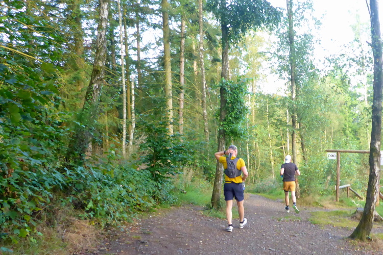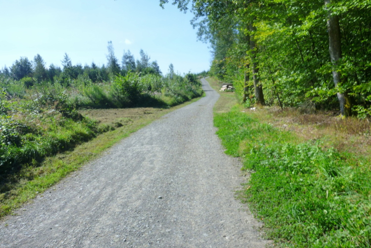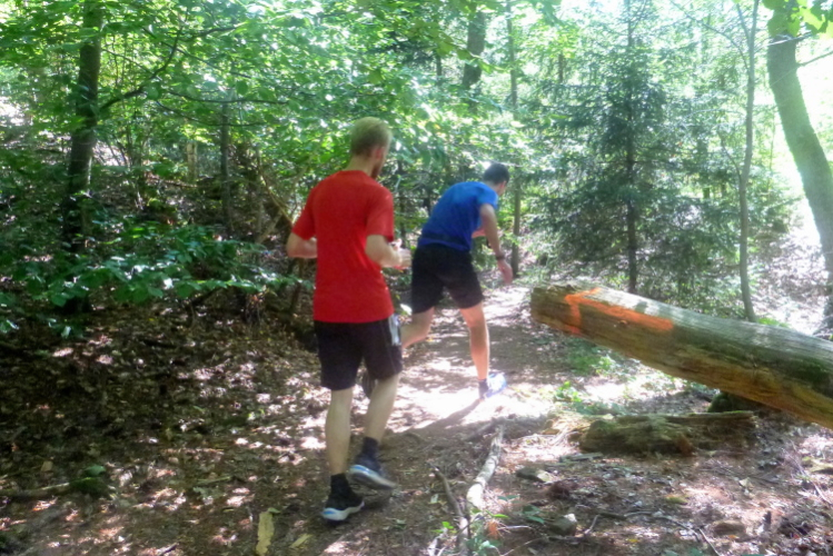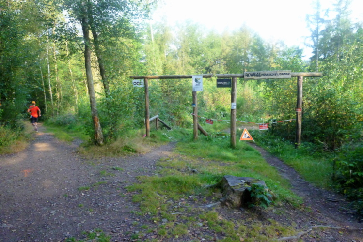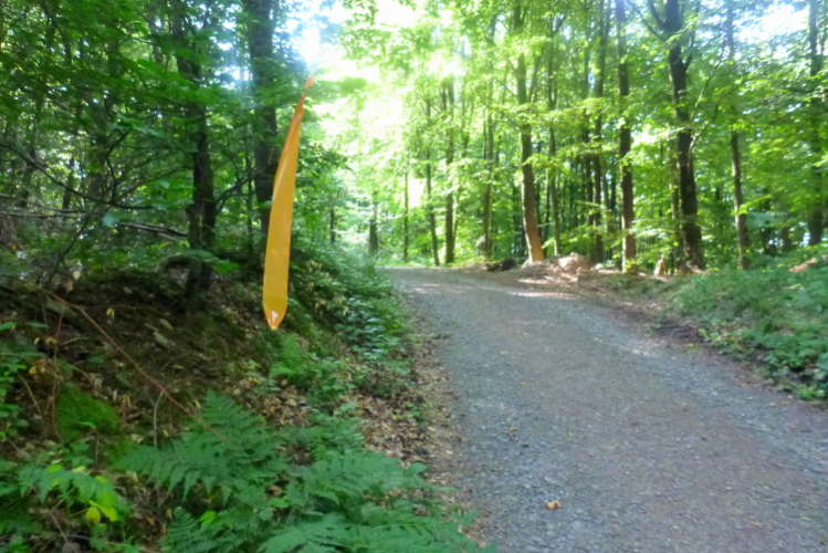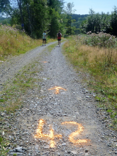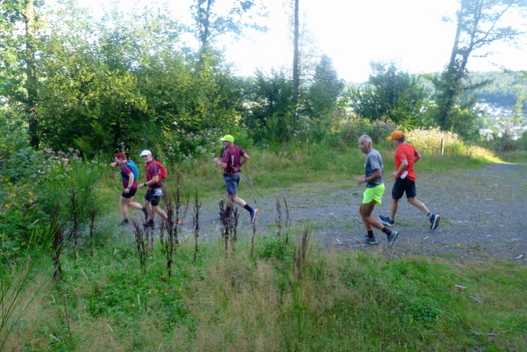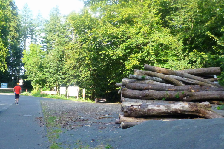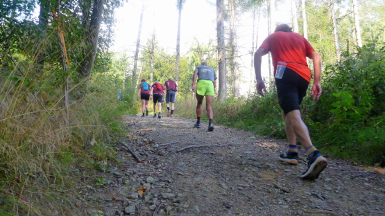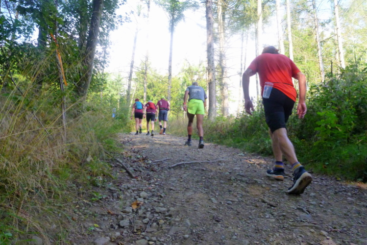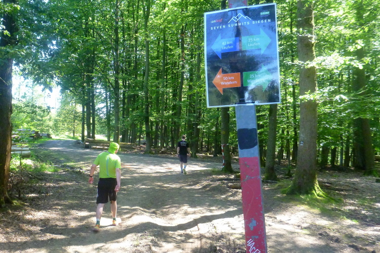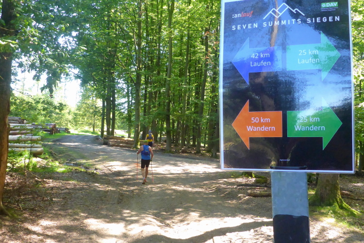 Wir kommen am Einstieg in den 2016 gebauten Flow Trail Siegen vorbei, der, vier km und 160 HM lang, mittlerweile zum Eldorado für Mountainbiker aus der gesamten Republik geworden ist. Auch so kann man den Fremdenverkehr sinnvoll stärken. An der Wegegabelung teilen sich auch die Strecken, wir Marathoner und die 50 km-Wanderer legen eine Extrarunde ein.