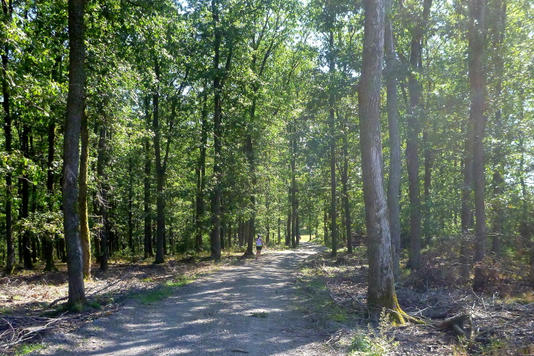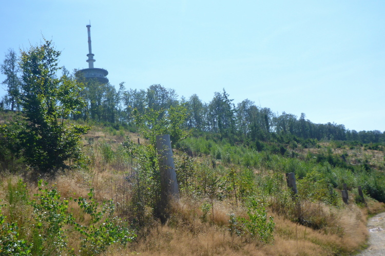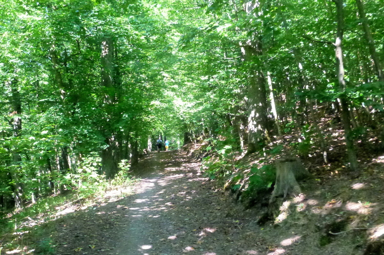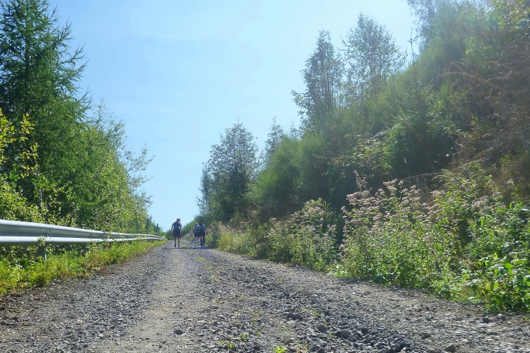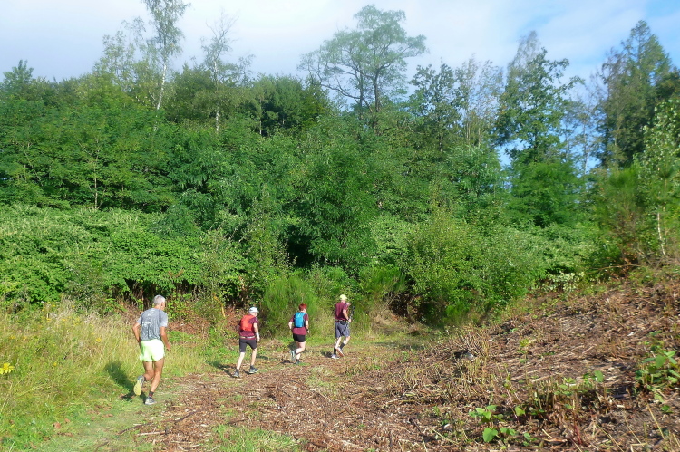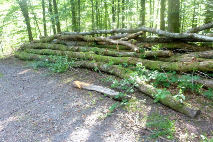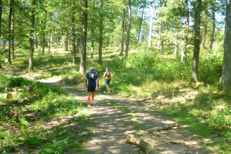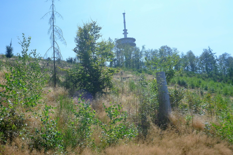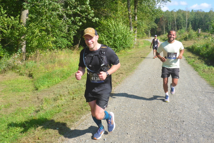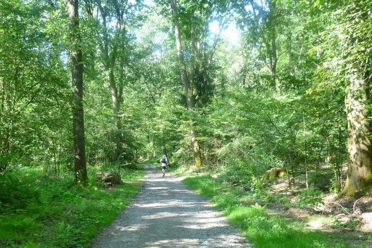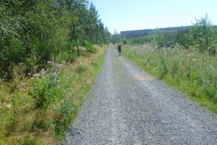 Wir kommen am Einstieg in den 2016 gebauten Flow Trail Siegen vorbei, der, vier km und 160 HM lang, mittlerweile zum Eldorado für Mountainbiker aus der gesamten Republik geworden ist. Auch so kann man den Fremdenverkehr sinnvoll stärken. An der Wegegabelung teilen sich auch die Strecken, wir Marathoner und die 50 km-Wanderer legen eine Extrarunde ein.