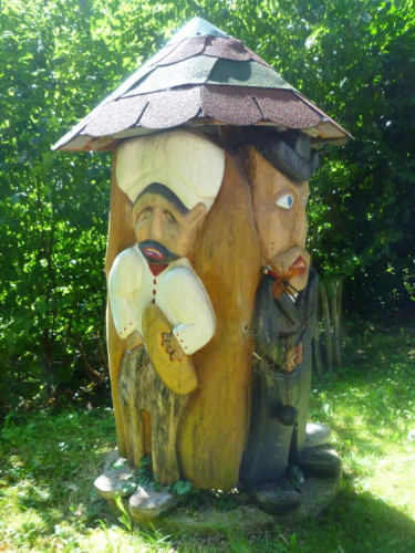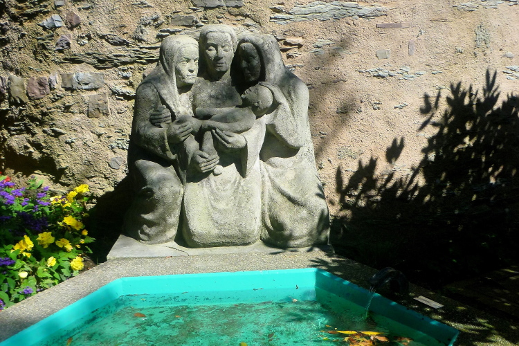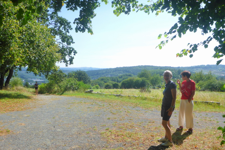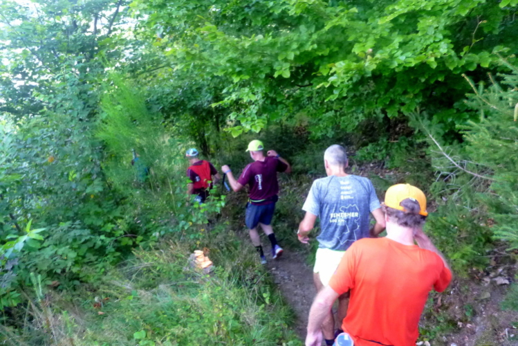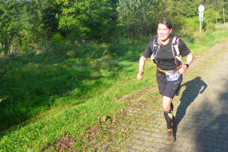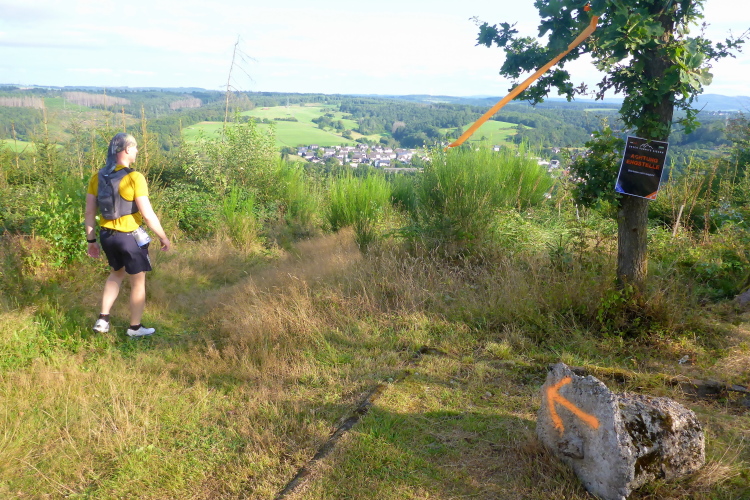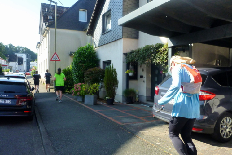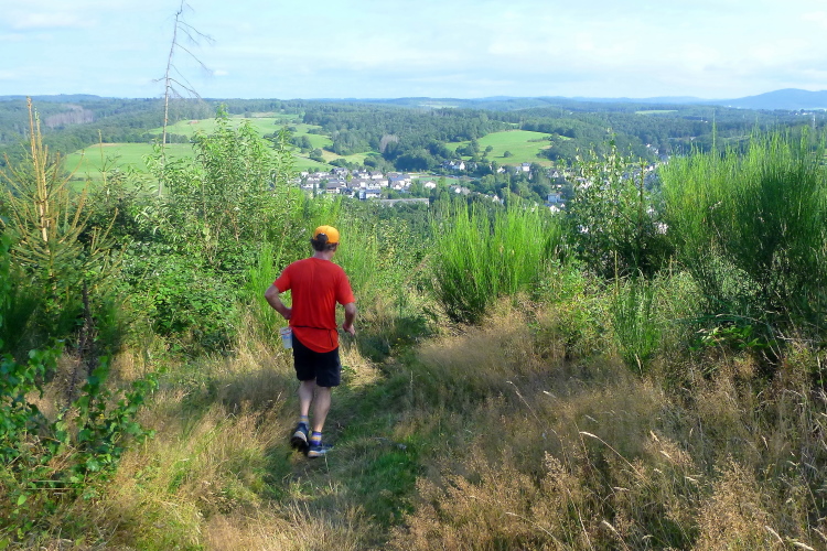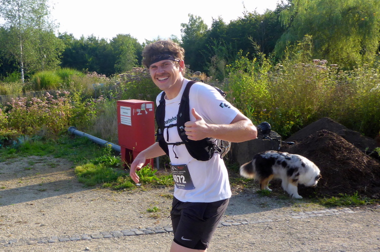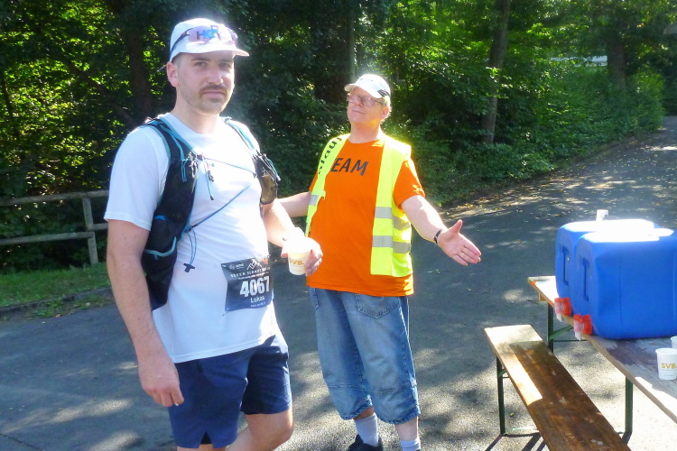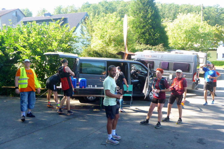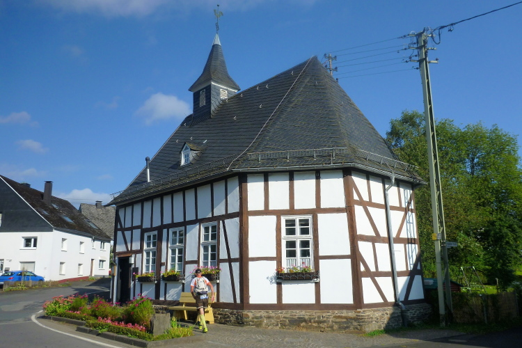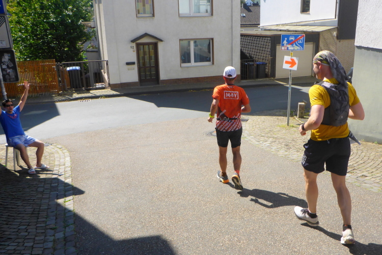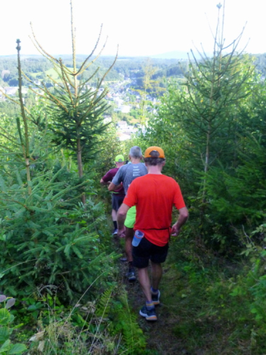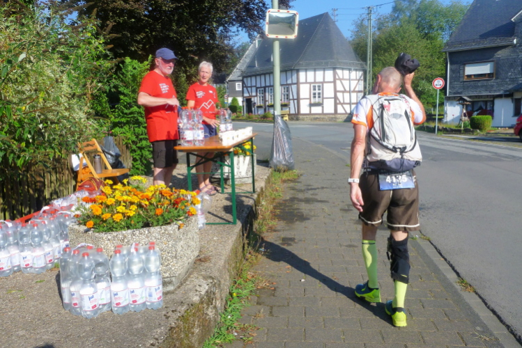 Über das Gelände des Jugendwerks Siegen mit einigen interessanten Gebäuden und Skulpturen müssen wir beim Abstieg über einen verwunschenen, zugewachsenen Trampelpfad Obacht geben, uns nicht auf die Nase zu legen und eiern gemeinsam hinunter. Belohnt werden wir nicht nur anfangs mit einer wunderbaren Aussicht, sondern im Tal auch mit dem ersten VP gegenüber einer hübschen Fachwerkkapelle, der unseren Wasserpegel wieder normalisiert.