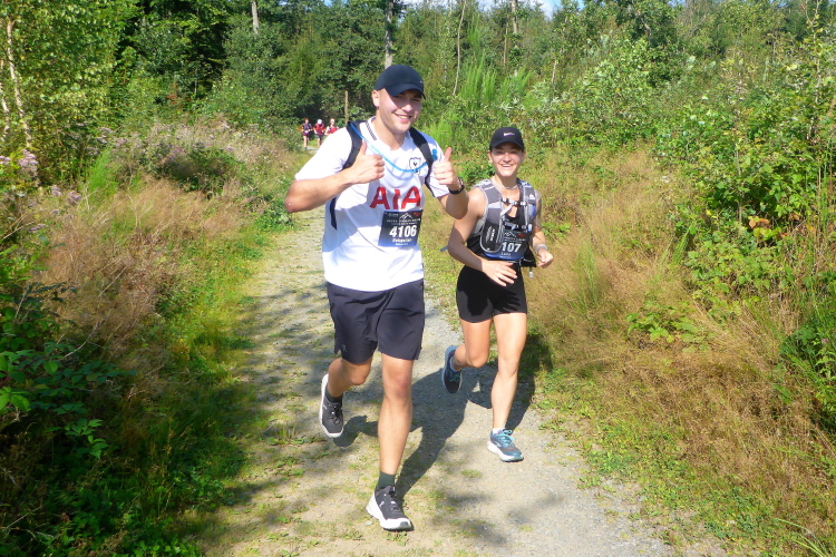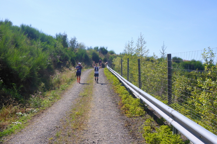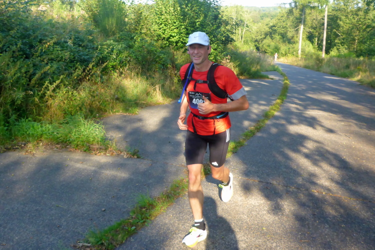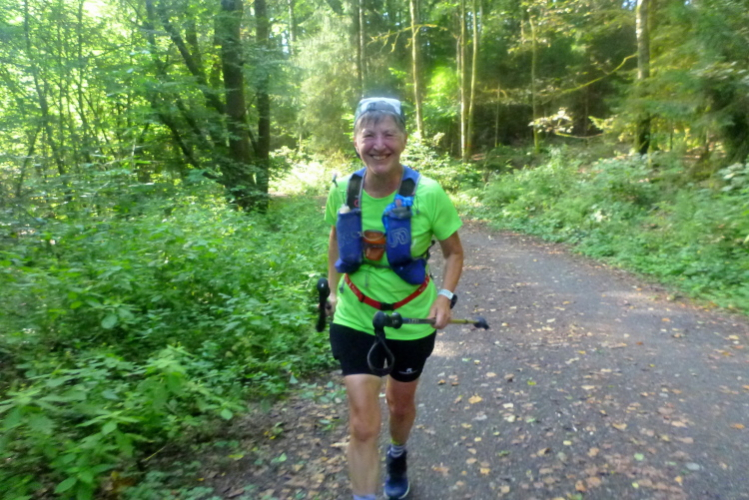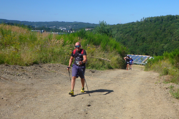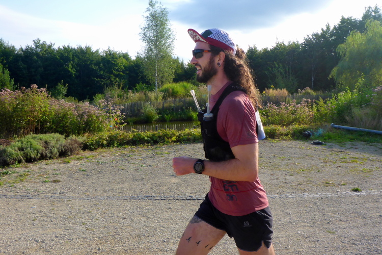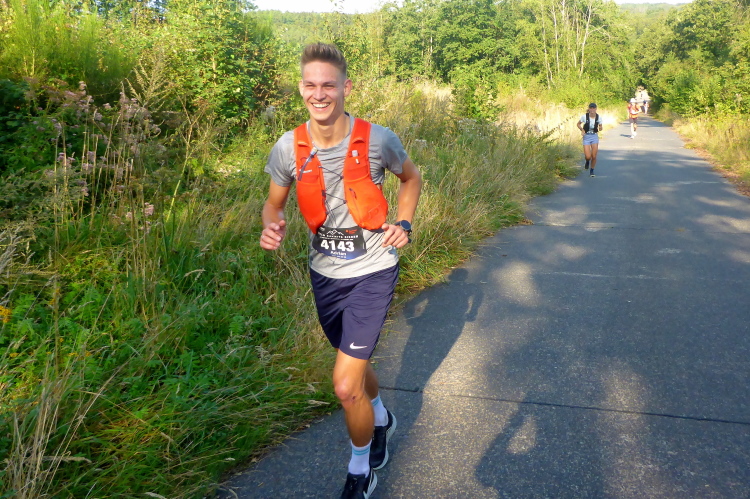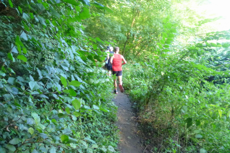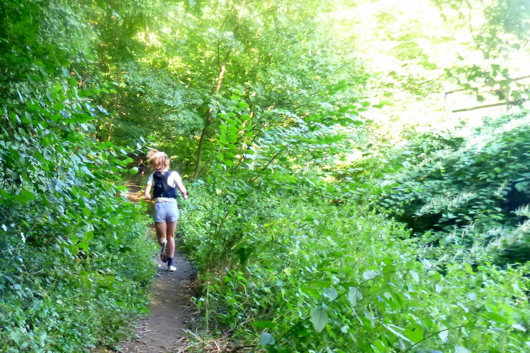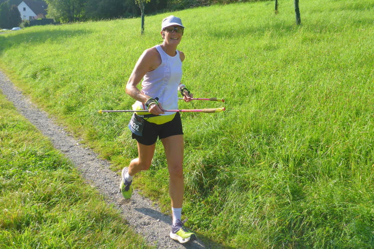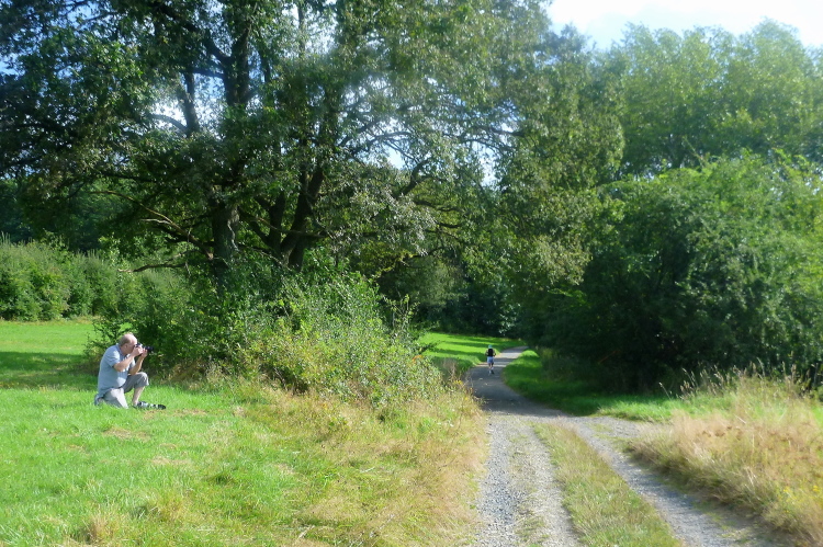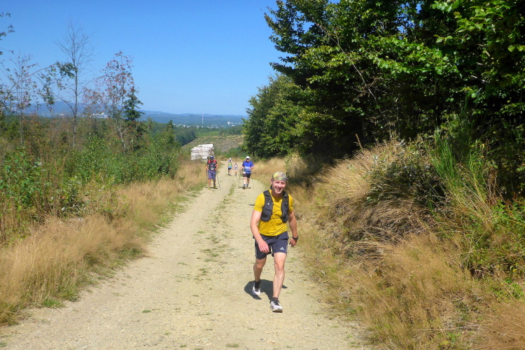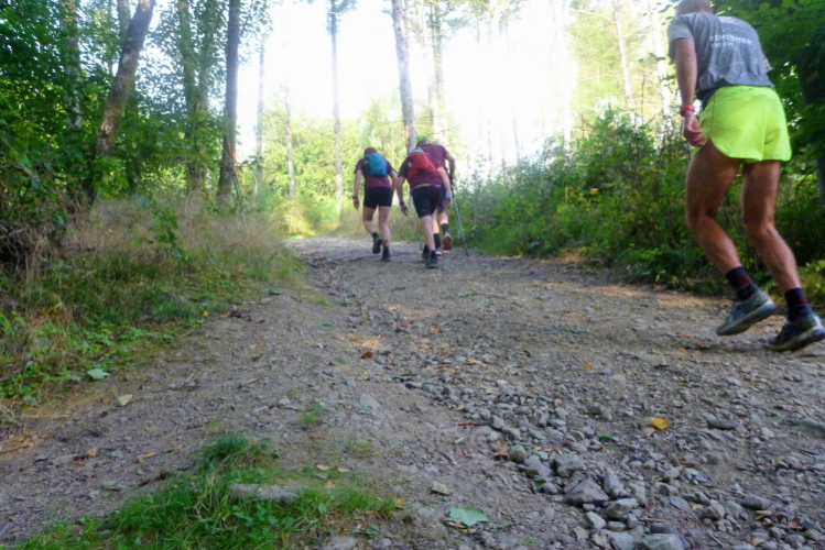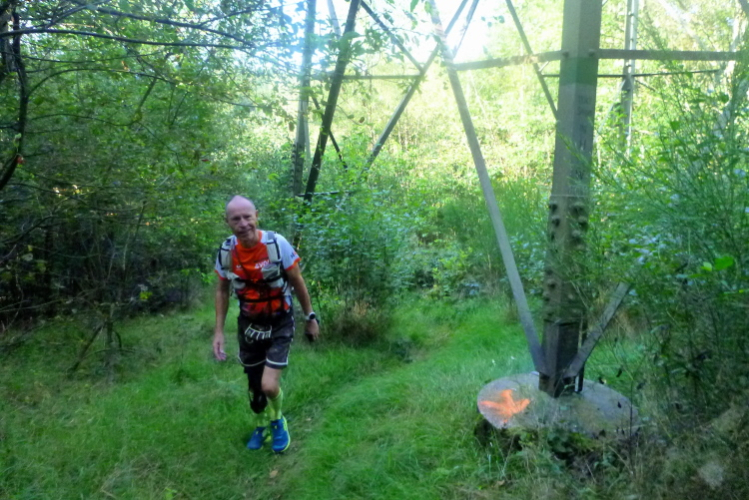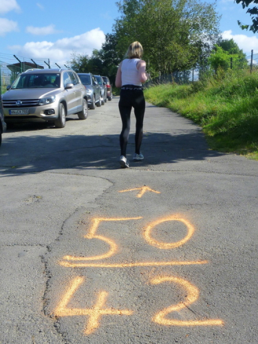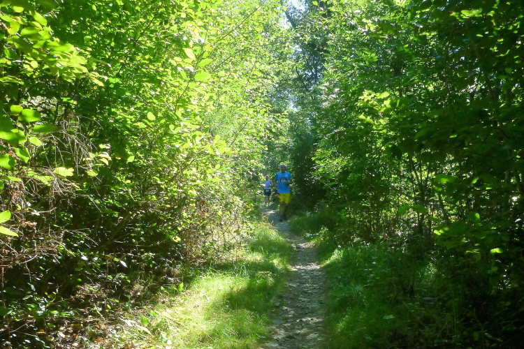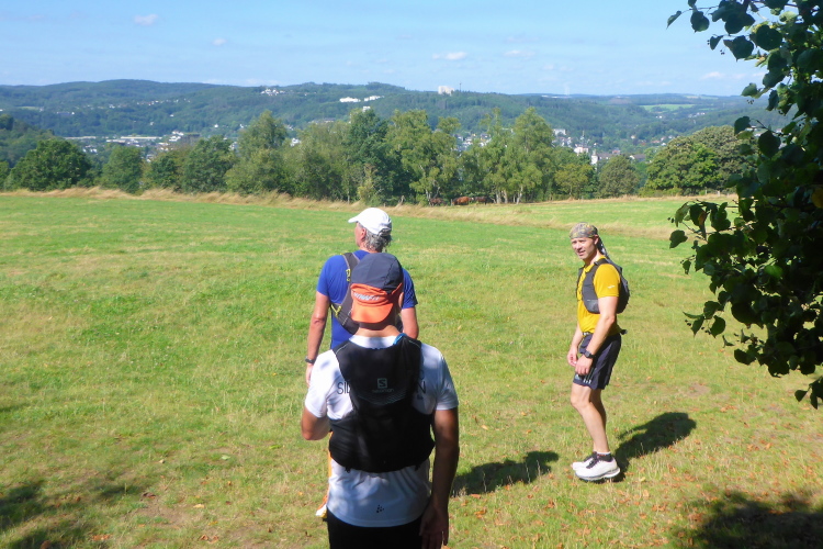 Kaum haben wir uns den Hang an großen Strommasten entlang hochgearbeitet, geht es auf bequemem Waldweg wieder hinunter. 80% der Wege, sagen uns die Veranstalter, sind Natur- und Waldwege, 20% liegen in der Stadt. Auf der Wiese lauert der Fotograf, aufgrund dessen segensreichen Wirkens wir uns hinterher kostenlose Heldenfotos von der Homepage herunterladen können, ein feiner Zug.