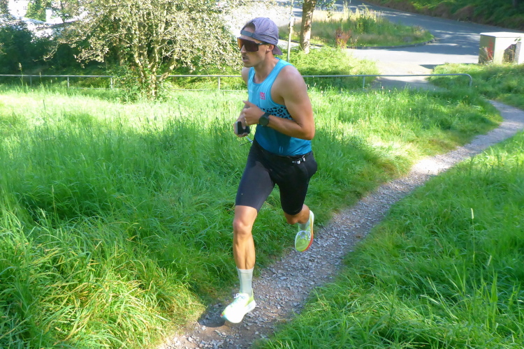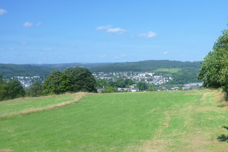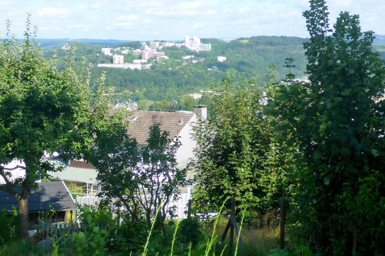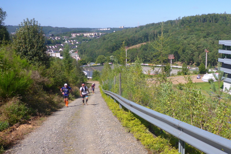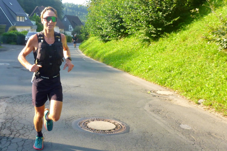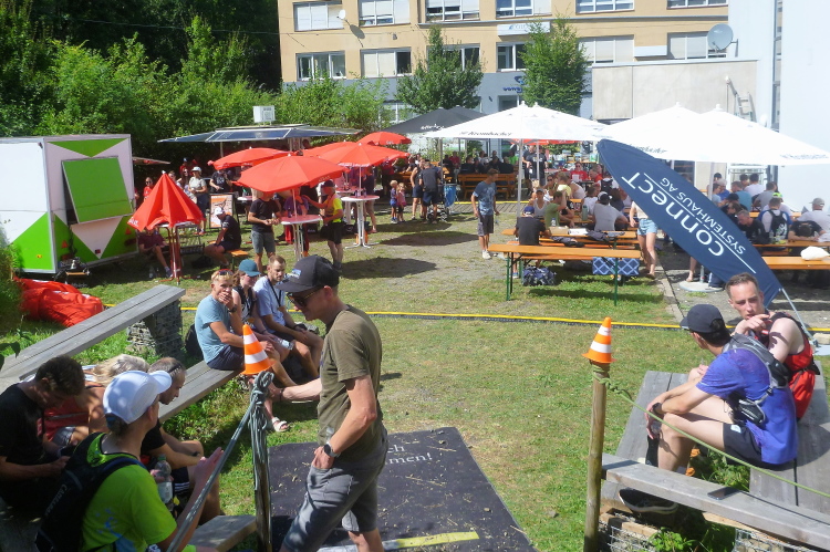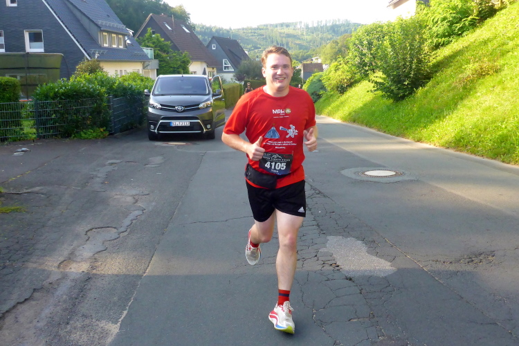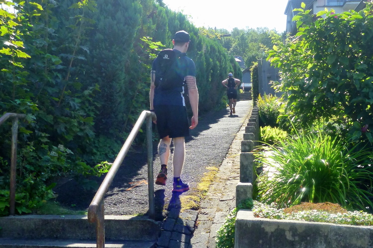 Laut schallt es aus dem Tal herauf, unter uns liegt neben einem Gewerbegebiet eine größere Sportanlage, wo im Leimbachstadion ebenfalls Schweiß vergossen wird, allerdings ohne umgeschnallte Startnummer. Im weiteren Auf und Ab erreichen wir die gegenüberliegende Talseite und gelangen schließlich zur finalen Qual: Über 1,22 km steigen wir 86 HM auf. Damit ist die Herausforderung Summit/Martin Hansel Challenge gemeistert, die man eben nach Martin Hansel, dem „Unverwüstlichen“, benannt hat.