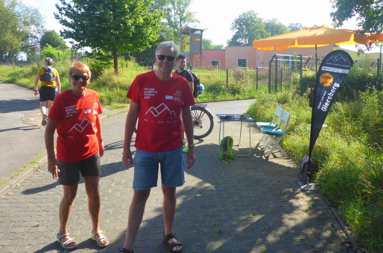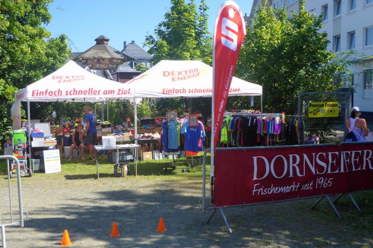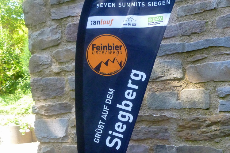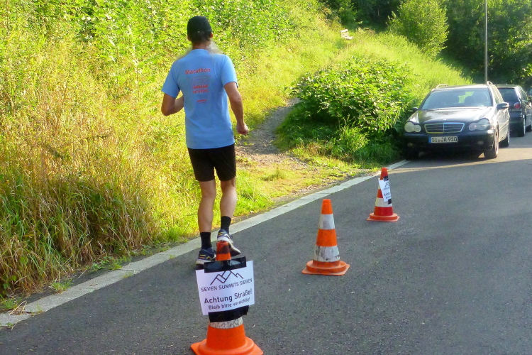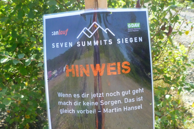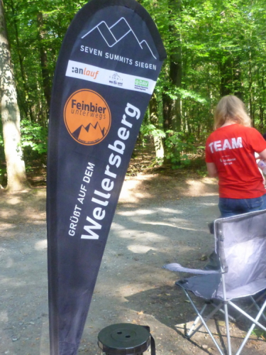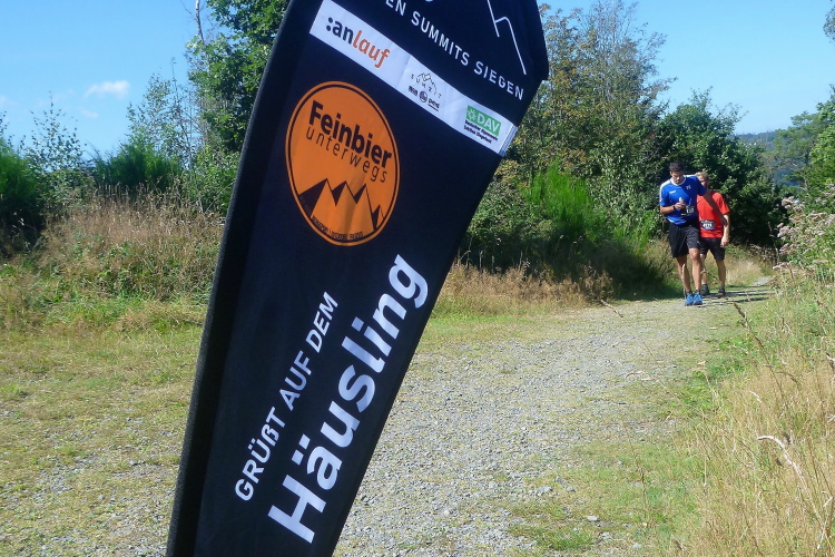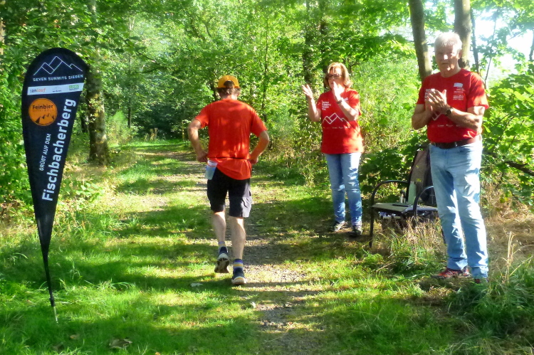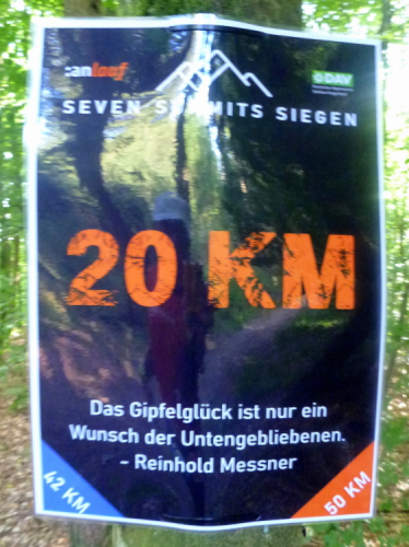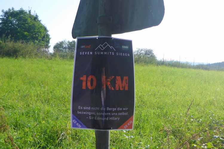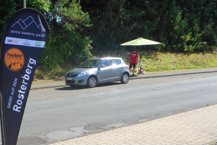 Ein Beachflag markiert eine hiesige Besonderheit, der sich noch sechs weitere anschließen werden. Es geht hierbei darum, die Zeiten von sieben Bergaufpassagen als Bergwertungen zu addieren. Damit möchte man uns zum lockeren Bergablaufen sowie Halten an den Ampeln motivieren. Nach 1,26 km des Bergaufhechelns über 75 HM erreichen wir mit dem Fischbacherberg nach knapp drei km den ersten der sieben Gipfel und haben damit auf 453 m Höhe auch schon den ersten Teil des zweiten Wettbewerbs innerhalb des heutigen Laufs geschafft.