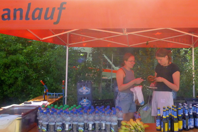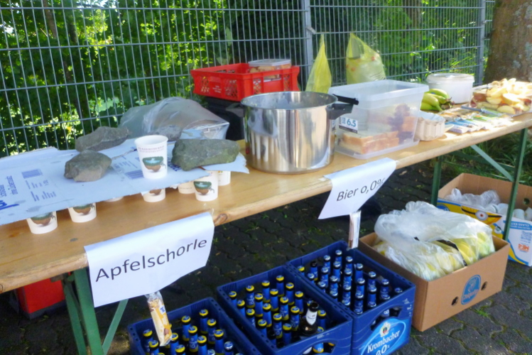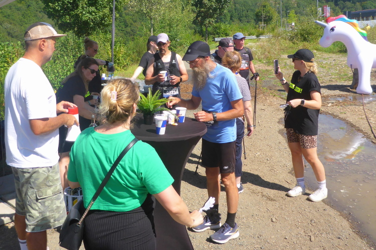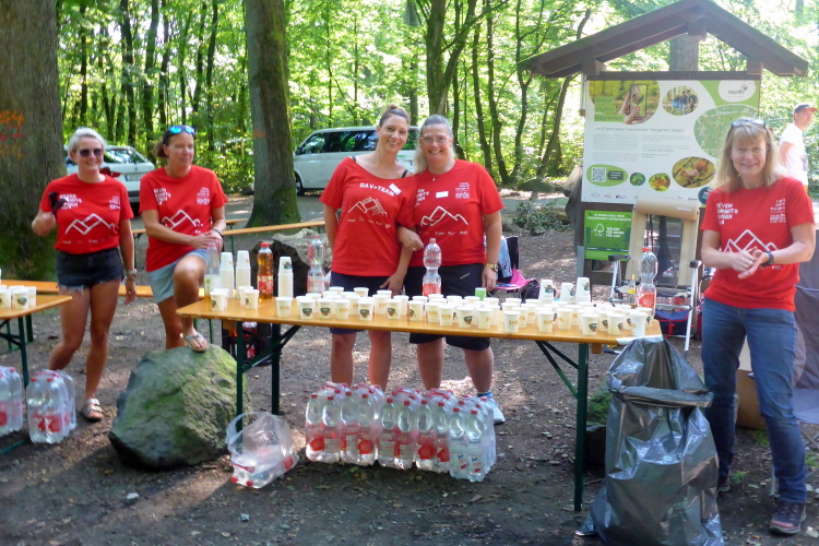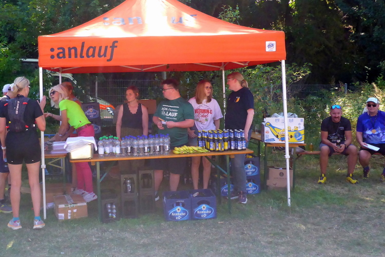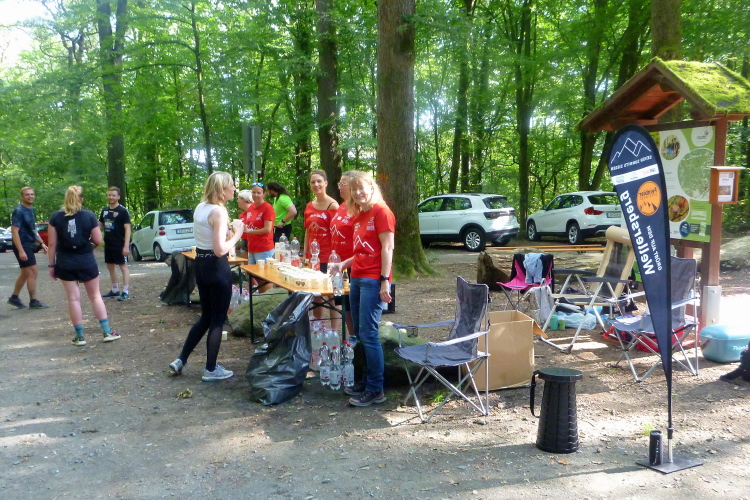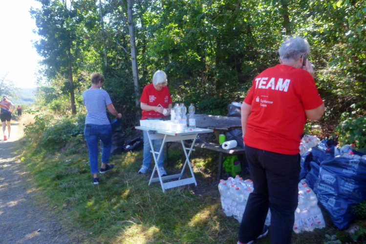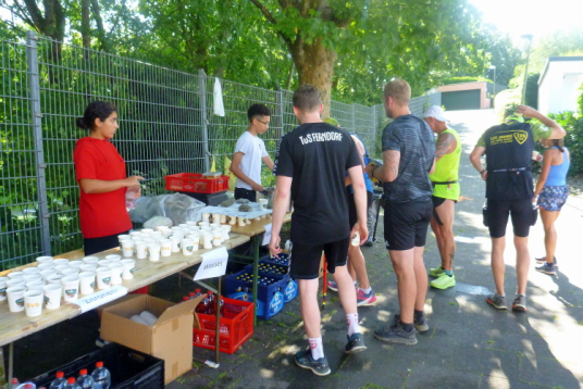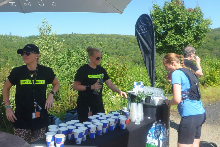 8 VP mit allem, was das Herz begehrt (Kaffee und Tee im Startbereich, 4 Verpflegungspunkte „Basic“ (57wasser, Krombacher 0,0, Obst, Riegel), 1 VP „Regional“ (Reibekuchen), 1 VP mit warmem Essen, Zielverpflegung am DAV Kletterzentrum (57wasser, Krombacher 0,0, Suppe).