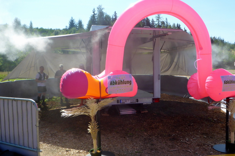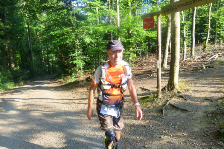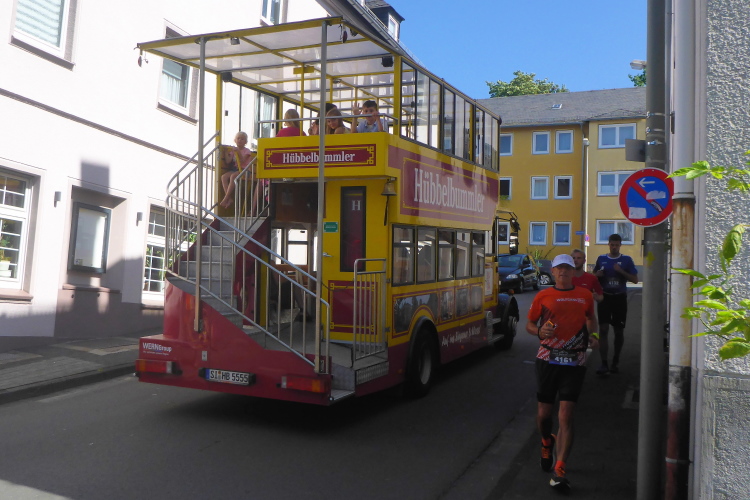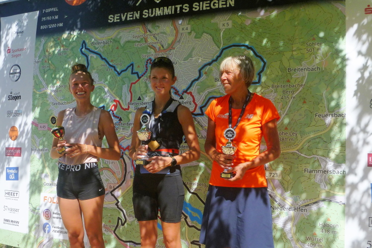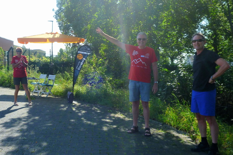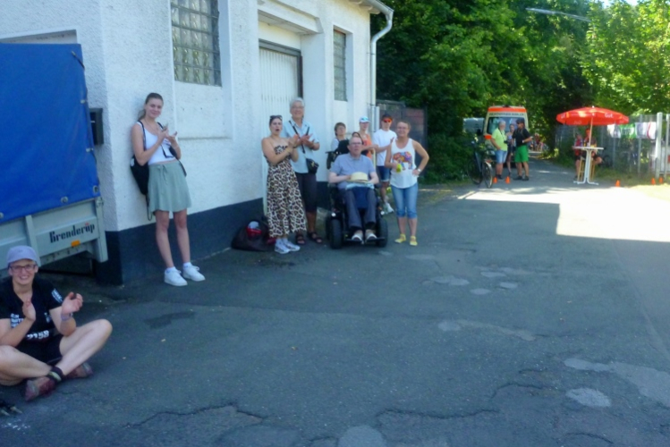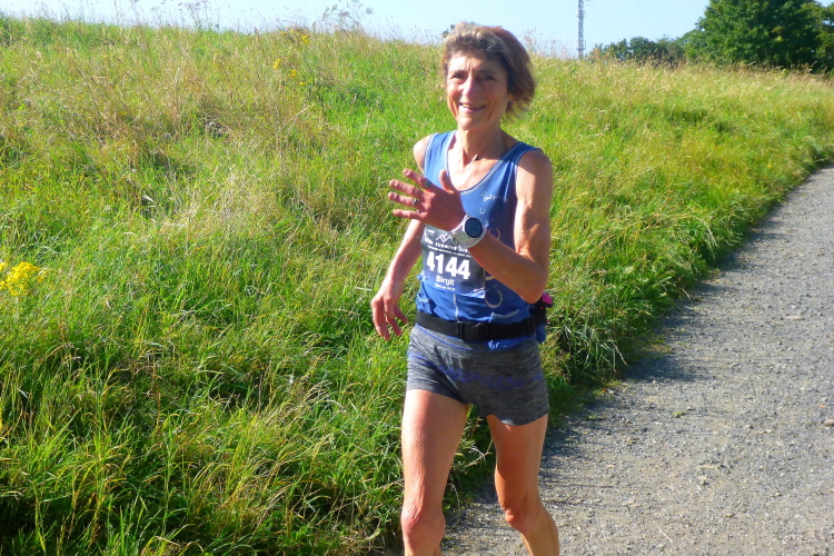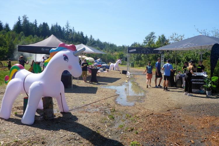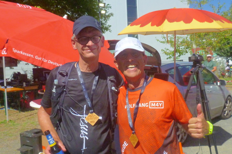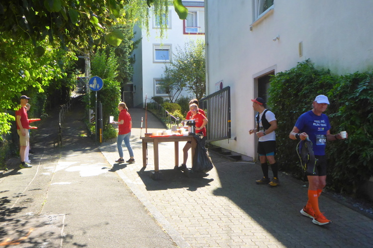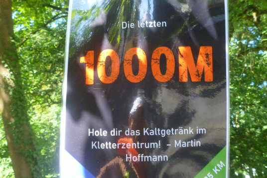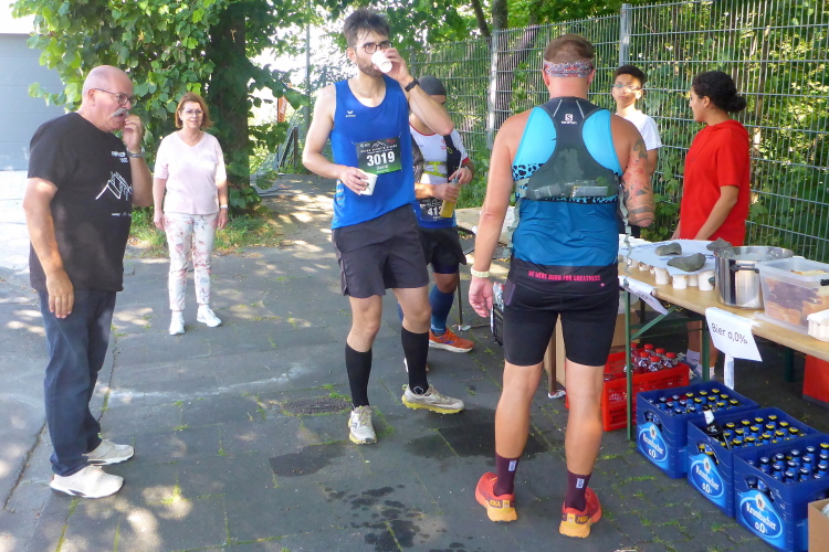 Nach der finalen Auftankung mit allem Notwendigen versehen und durch Sprühnebel aus bunten Einhörnern erfrischt, trete ich die letzten km an. Doch die Erfrischung gleicht einer Henkersmahlzeit, denn um die 180°-Kurve gebogen, zieht mir ein strammer Aufstieg in praller Sonne sämtliche Zähne. Nahe komme ich dem WDR-Funkturm, dann beglückt mich meine Uhr mit der Botschaft „40 km“, gefolgt von einem Streckenschild „Die letzten zwei km!“. Die beinhalten nochmals einen netten Trail, bevor ich durch die Stadt mit dem DAV-Kletterzentrum nach knappen fünfeinhalb Stunden das heutige Ziel erreiche. Mehrere Kaltgetränke beleben mich wieder, bevor ich (bei sehr überschaubarer „Konkurrenz“) tatsächlich nochmal zu einer Siegerehrung darf, denn die Opa-Klasse habe ich für mich entschieden.