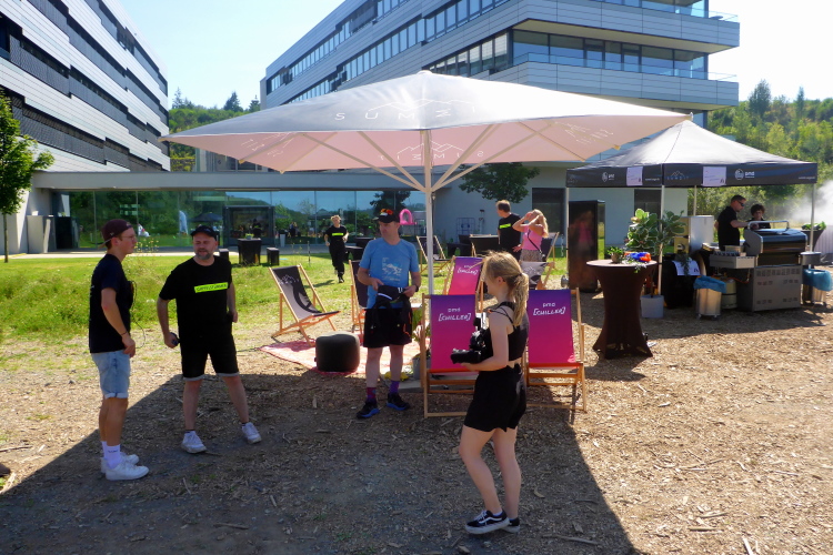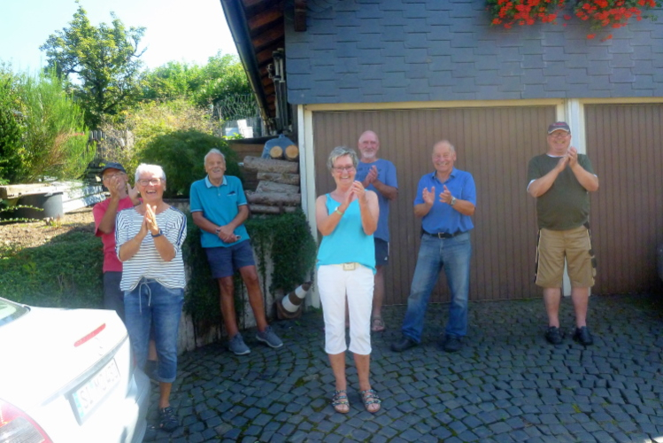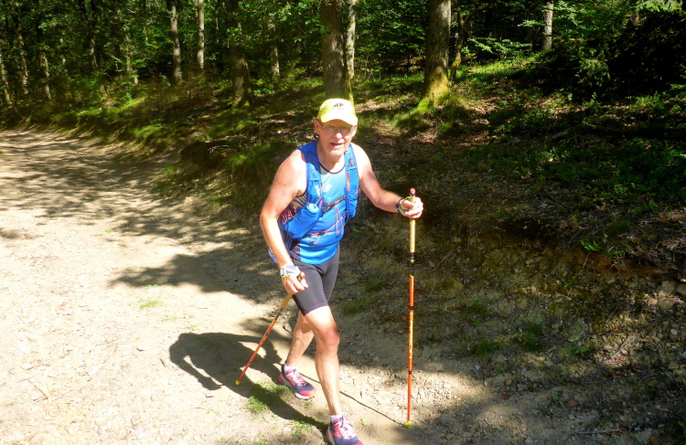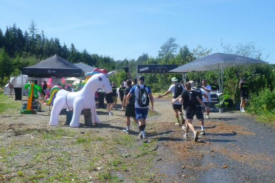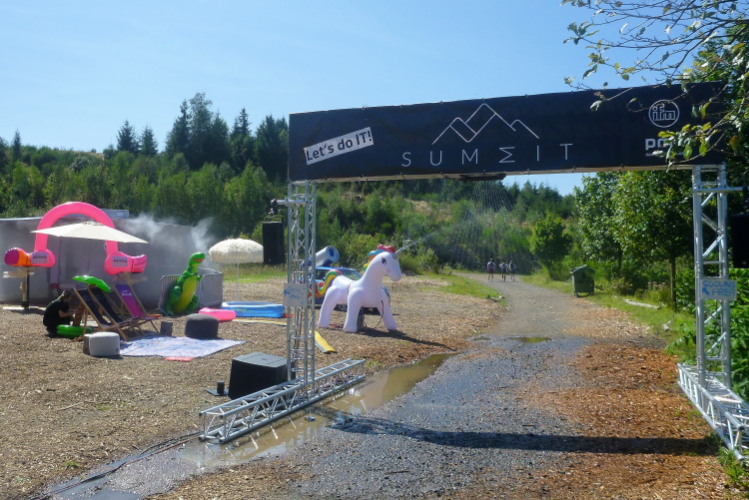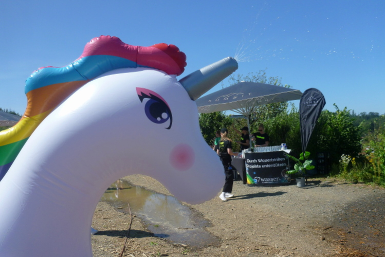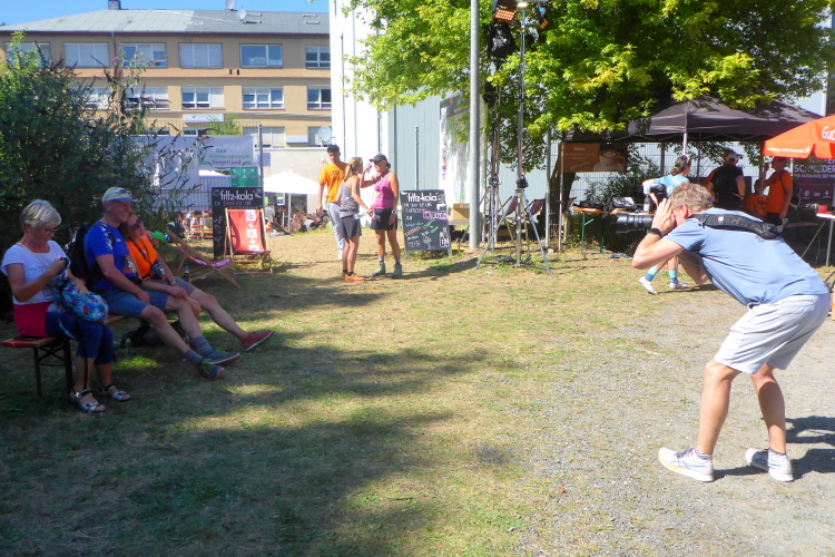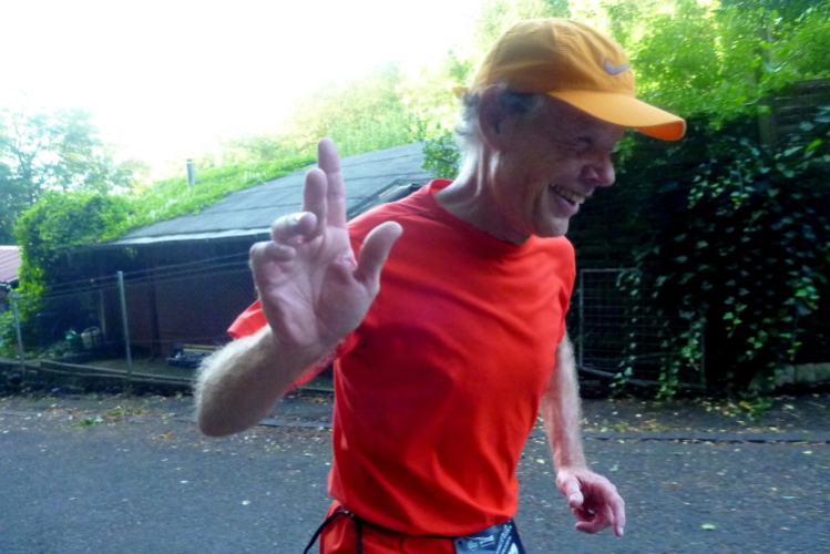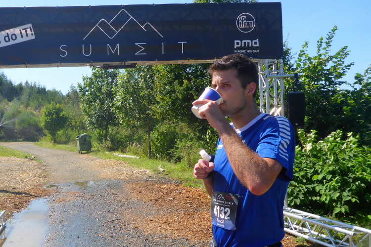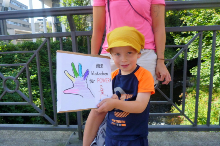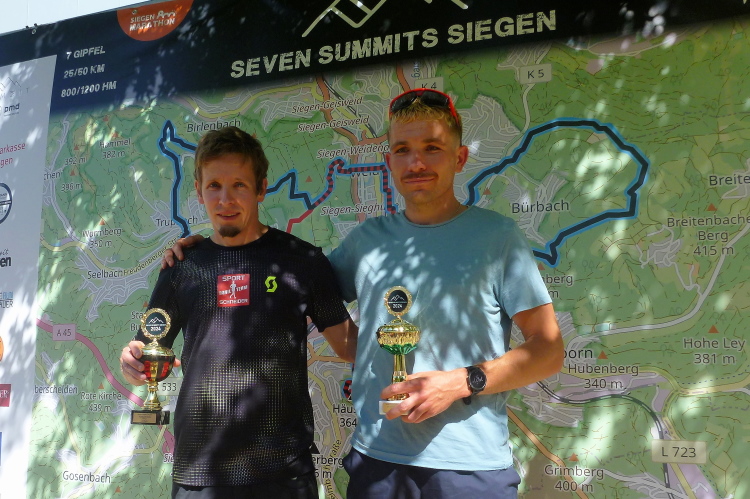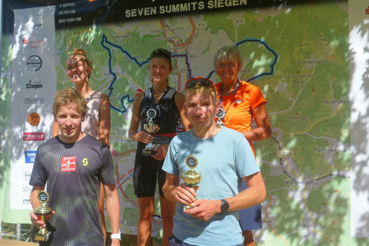 Nach der finalen Auftankung mit allem Notwendigen versehen und durch Sprühnebel aus bunten Einhörnern erfrischt, trete ich die letzten km an. Doch die Erfrischung gleicht einer Henkersmahlzeit, denn um die 180°-Kurve gebogen, zieht mir ein strammer Aufstieg in praller Sonne sämtliche Zähne. Nahe komme ich dem WDR-Funkturm, dann beglückt mich meine Uhr mit der Botschaft „40 km“, gefolgt von einem Streckenschild „Die letzten zwei km!“. Die beinhalten nochmals einen netten Trail, bevor ich durch die Stadt mit dem DAV-Kletterzentrum nach knappen fünfeinhalb Stunden das heutige Ziel erreiche. Mehrere Kaltgetränke beleben mich wieder, bevor ich (bei sehr überschaubarer „Konkurrenz“) tatsächlich nochmal zu einer Siegerehrung darf, denn die Opa-Klasse habe ich für mich entschieden.
