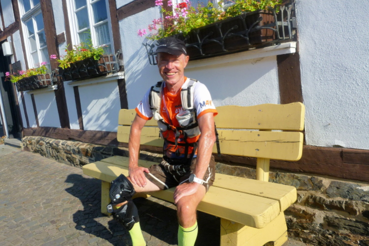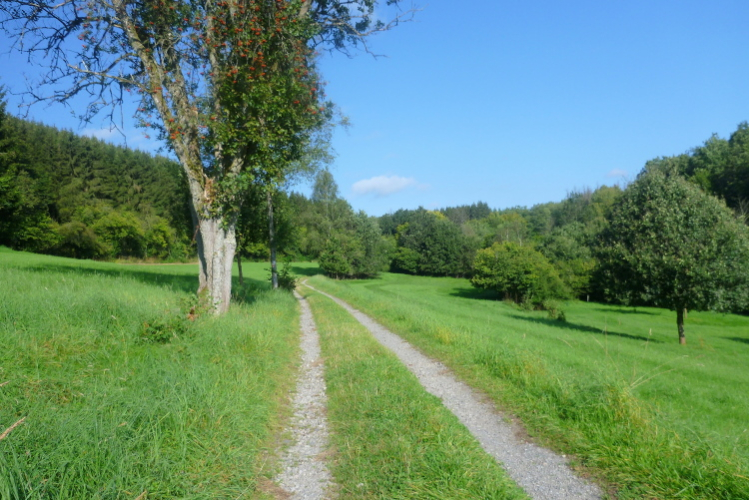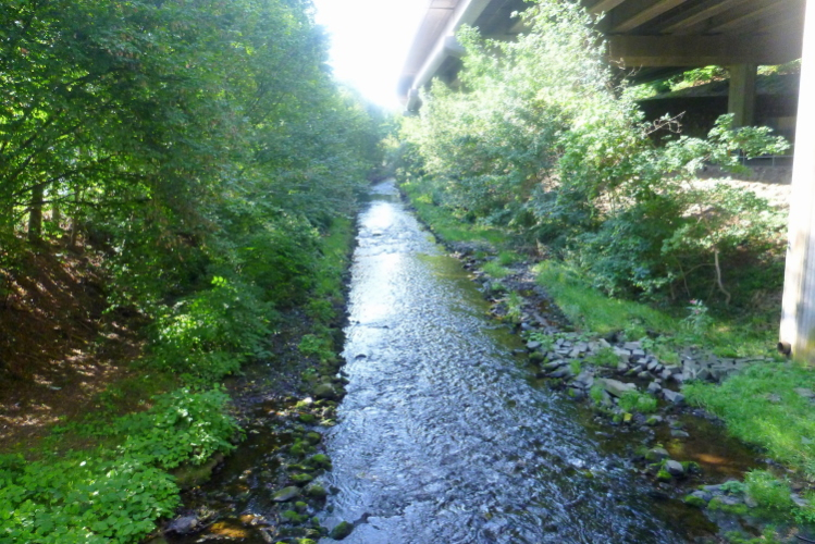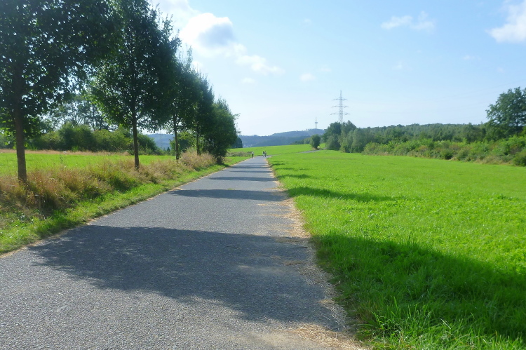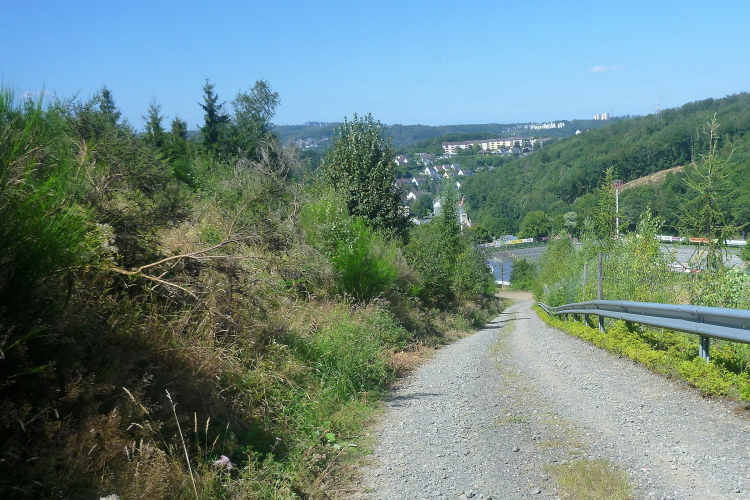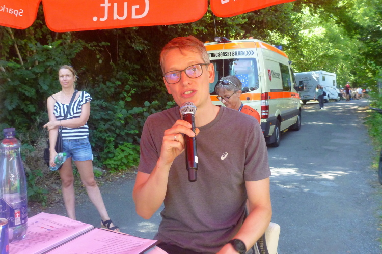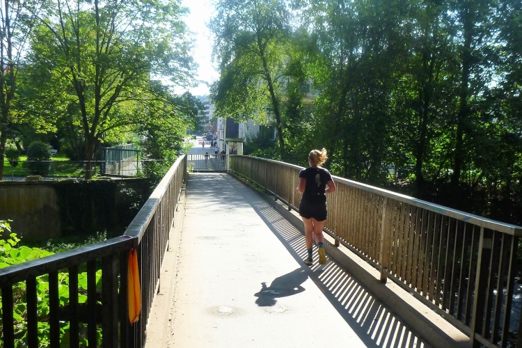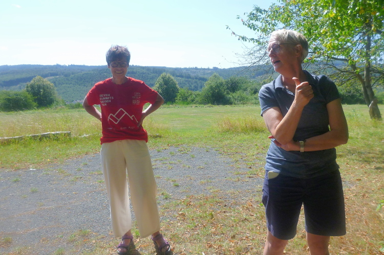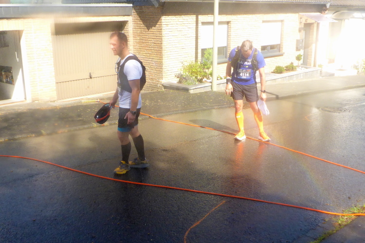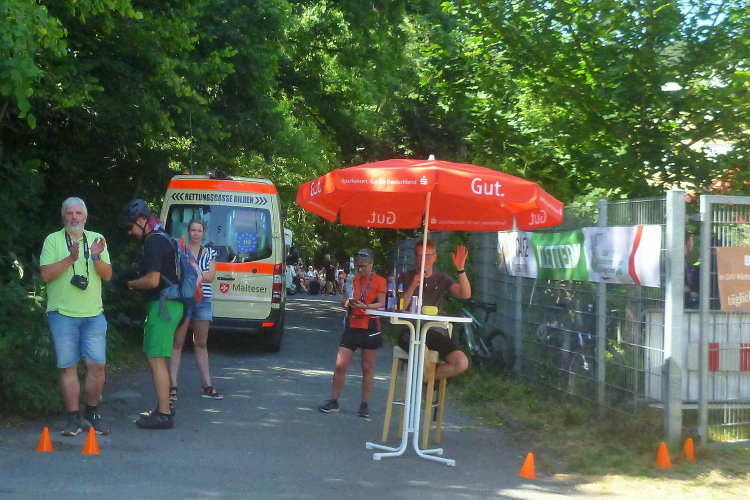 Der Aufstieg zum Lindenberg als vierte Bergwertung hat trotz der Treppen etwas Mitleid mit uns, denn die hier zu bewältigenden 105 HM verteilen sich auf 1,35 km. Die zunehmende Beanspruchung der Beinmuskulatur lässt den Unterschied zu der vorangegangenen durchschnittlichen Steigung von 11,1 % allerdings nicht wirklich spüren. Die beiden Helferinnen auf dem Lindenberg deuten meinen etwas ratlosen Blick richtig: „Ja, Du bist auf dem Lindenberg. Leider hat uns der Beachflag nicht erreicht.“ Egal, Hauptsache oben. Wie gewonnen, so zerronnen, es geht wieder bergab. Mehrfach überqueren wir die Weiss, aber auch wieder die Sieg, die auf ihrem Weg zum Rhein 155 km zurücklegt.