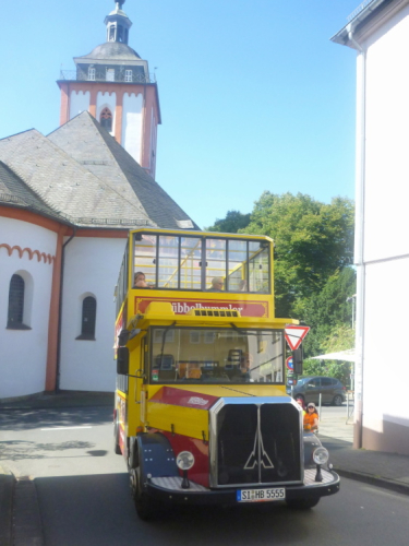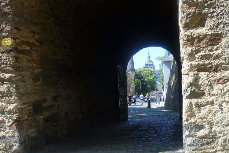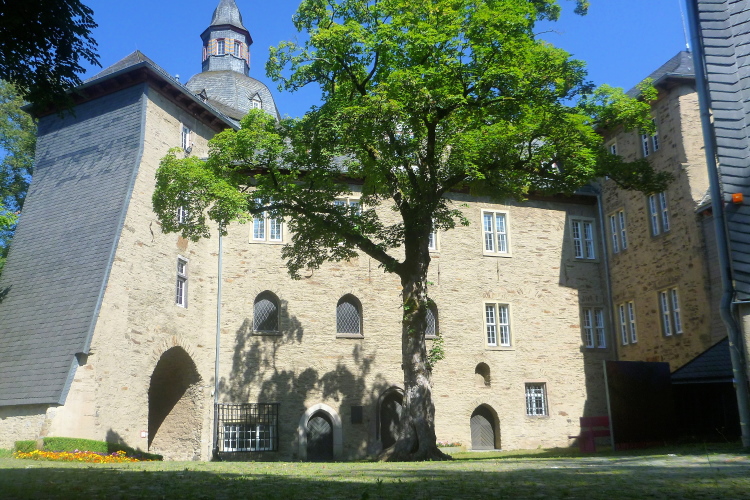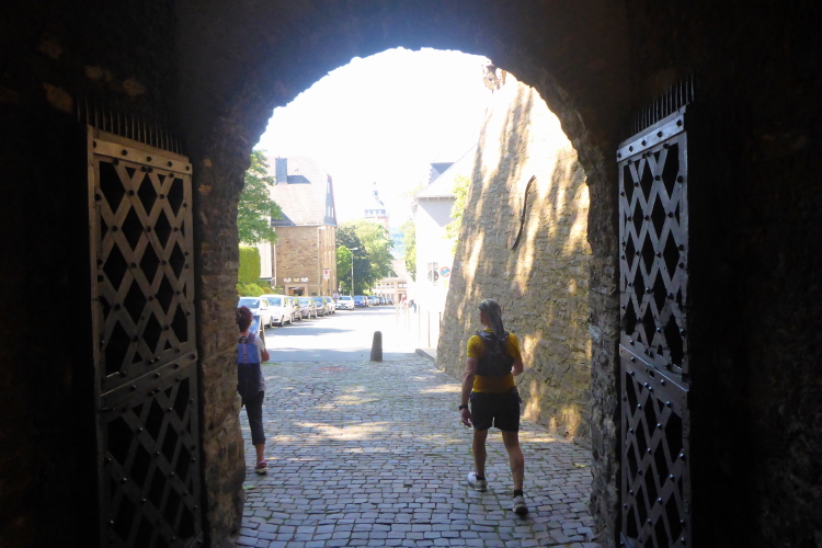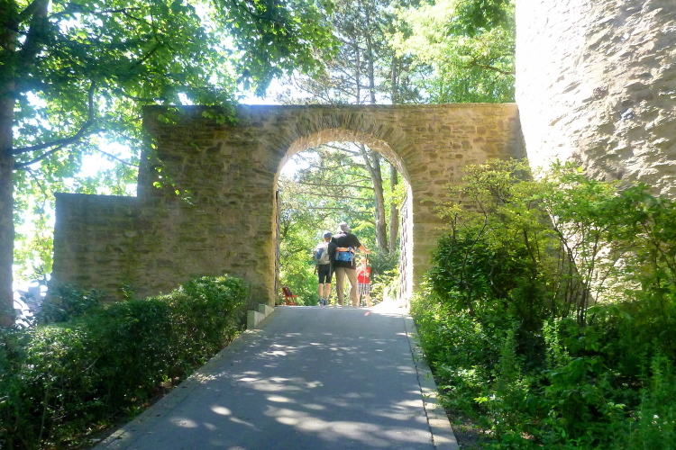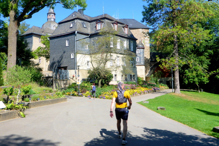 Der Blick über die Stadt ist herrlich, aber auch der auf den nächsten VP, dem ich mich hingebungsvoll widme. Diesen betreibt der sehr freundliche Dirk Büdenbender, der mit seiner Frau in dritter Generation u.a. das Hotel Bürger führt. Kaum Freundschaft geschlossen, muß ich schon weiterziehen, denn mit dem Siegberg wartet am Fuße des Schlossparks die kürzeste und harmloseste der sieben Bergwertungen, denn hier sind lediglich 17 HM auf 340 m zu nehmen. Aber sehr attraktive! Mir gefällt die schön restaurierte Schlossanlage sehr gut.