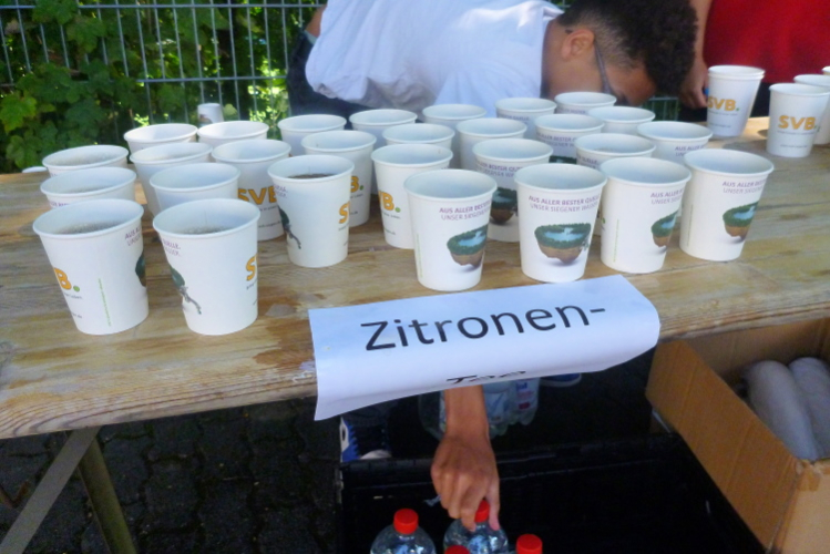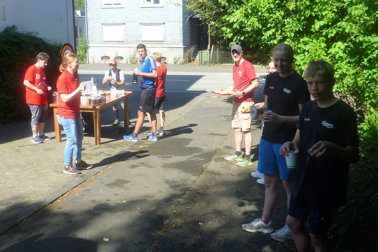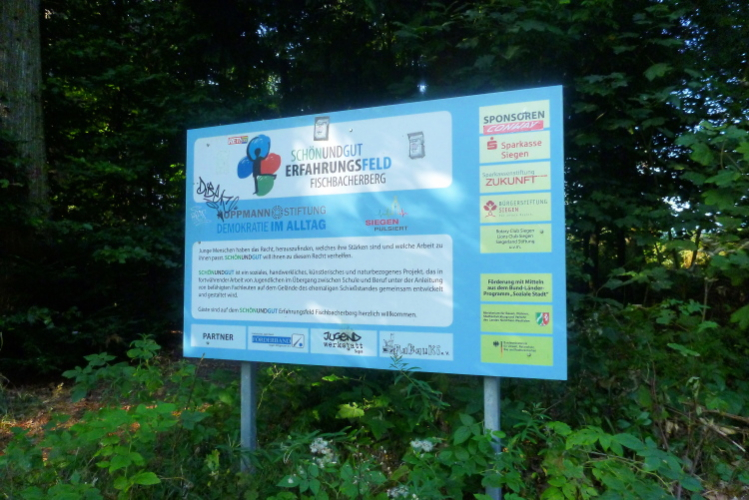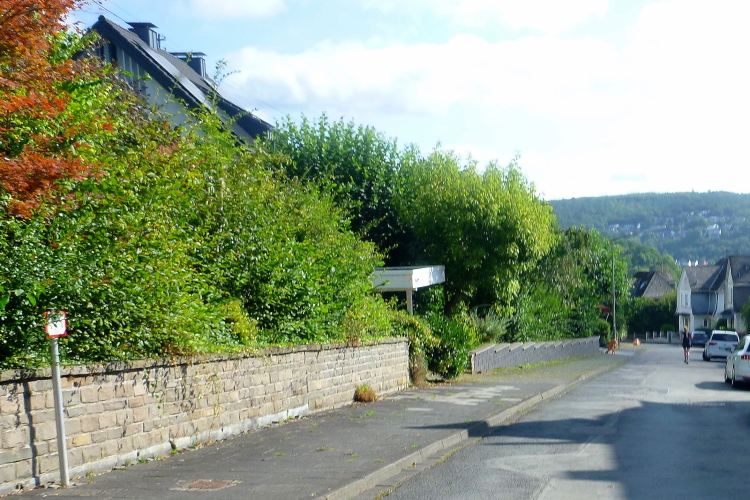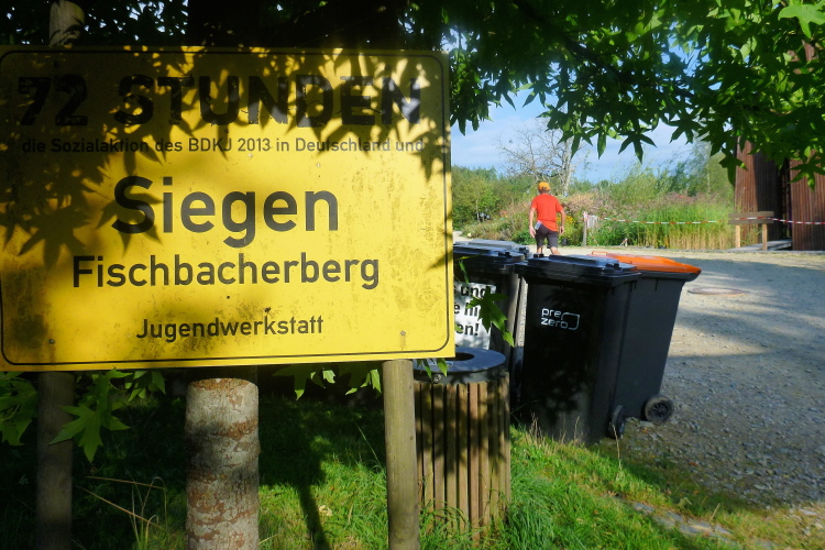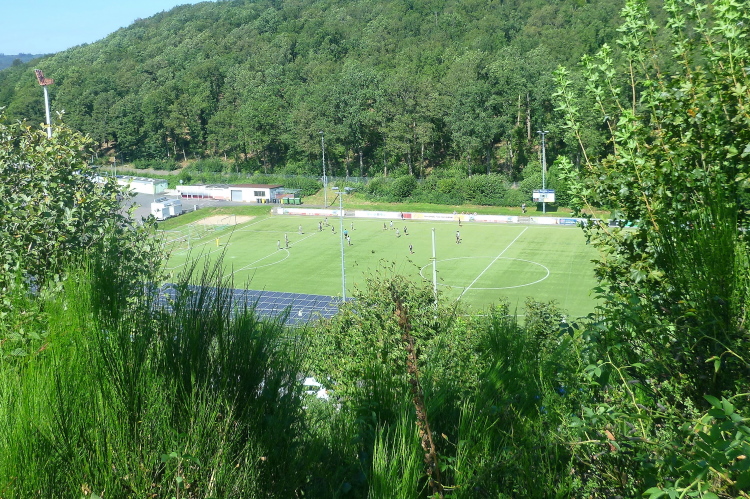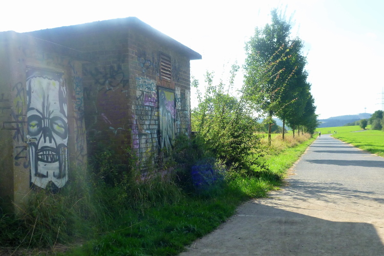 Kurz (700 m) und knackig (60 HM) geht’s auf den Wellersberg als zweite Bergwertung hinauf. Atzung, die zweite, diesmal auch mit Apfelschorle. Wir umrunden auf der Panzerstraße die in den fünfziger Jahren angelegte Panzerwiese seligen Andenkens an die Einheiten der belgischen Armee, die zeitweise hier stationiert war. In Weidenau begrüßt uns eine Glück-auf-Kampfbahn, die mir zum zweiten Mal den von den BVB-Anhängern heißgeliebten Revierclub nahebringt. Arbeiter der Weidenauer Grube Neue Hardt kickten dort nach einem harten Arbeitstag auf dem Ascheplatz.
