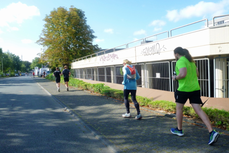 Das Startprozedere ist ein in Nicht-Pandemiezeiten ungewöhnliches: Der Beginn des Marathons zieht sich nämlich von 08:00 bis 08:30 Uhr hin, wobei minütlich in Kleingruppen gestartet wird. Die jeweils verbindliche, genaue Startzeit wurde vorab mitgeteilt bzw. hängt aus und ist sogar auf der Startnummer gedruckt. Ältere Herren sind ja für jede Hilfe dankbar. Als Spätanmelder bin ich erst um 8:28 Uhr dran. Der Grund erschließt sich vor Ort schnell: Würde man die immerhin gut 160 Vorangemeldeten auf einen Schlag von der Leine lassen, würde das einen veritablen Stau verursachen. Denn da der Lauf über öffentliche Wege und Straßen führt, mussten wir uns schriftlich verpflichten, die Straßenverkehrsordnung einzuhalten.