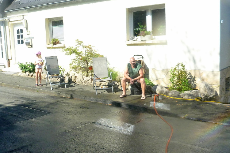 Eine unverhoffte, kurzfristig eingerichtete Wasserstelle rettet mich wieder einmal und stärkt mich vor den nächsten, steilen Treppen. „Hopp, Arno, auf geht’s“! Arno gehorcht seiner Gattin und setzt für mich und meine Begleiter den Wasserschlauch in Gang. Ahhh! Danke, Arno, das tat gut!