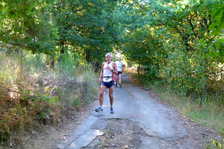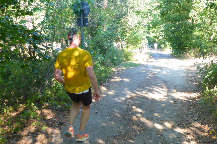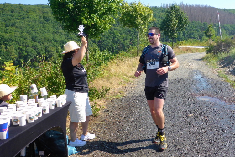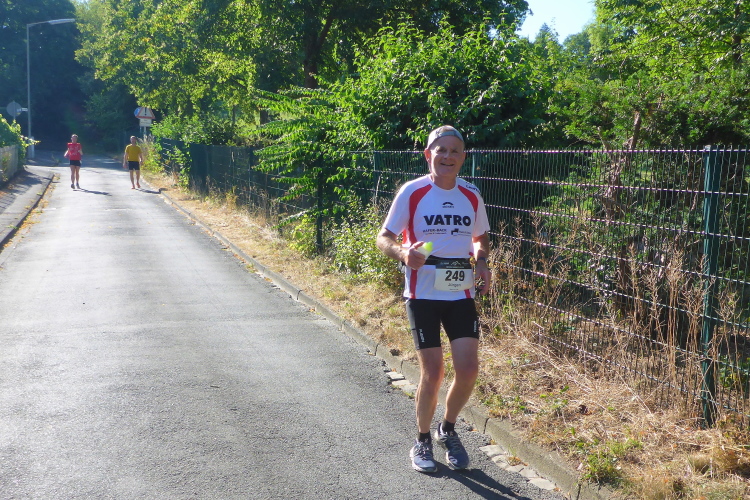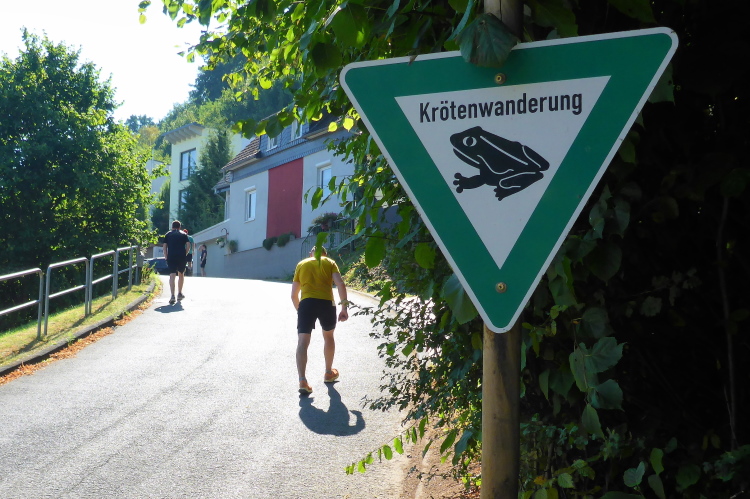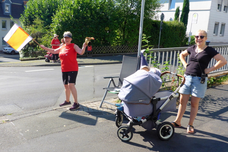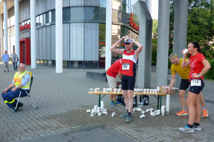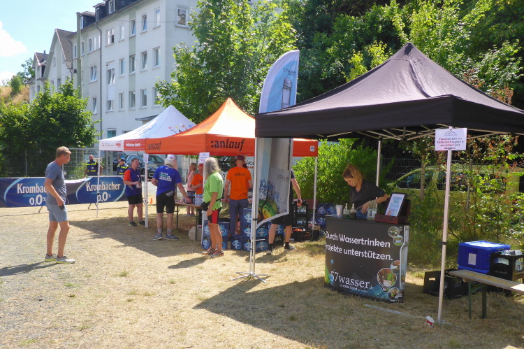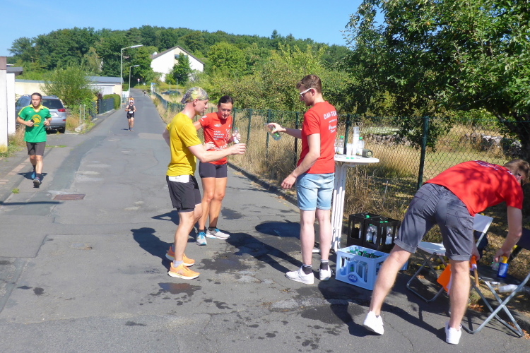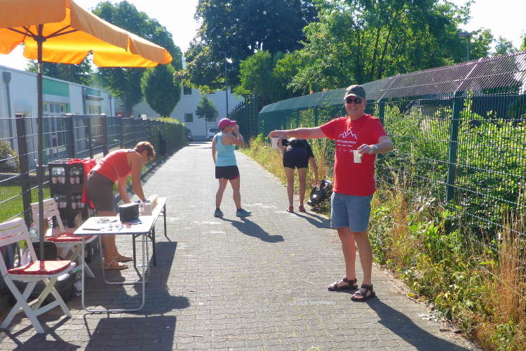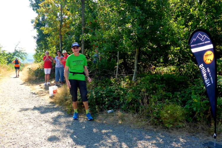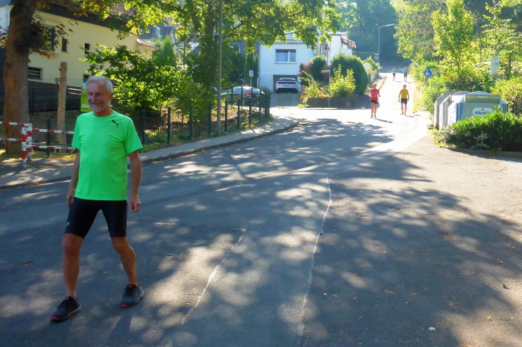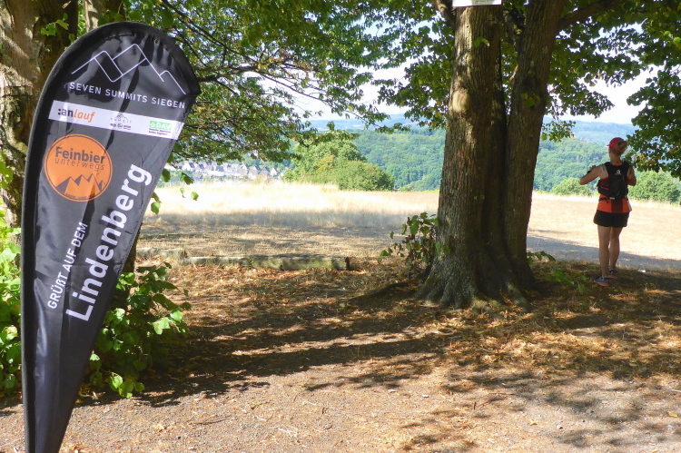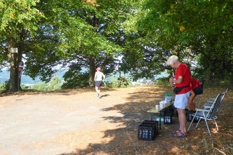 Drei sind hin, noch vier im Sinn! Mit dieser Ansage geht nach einer weiteren Ampelquerung wieder mal steil bergauf, wir steuern den höchsten Punkt unserer heutigen Reise an. Summit No. 4 ist der 374 m hohe Lindenberg. Auf dem Weg nach oben haben die ersten Anwohner Mitleid mit uns, ein über die Straße gezogener Bewässerungsschlauch sorgt für eine kleine Abkühlung mit 1 m hohen Wasserfontänen. Ich werde kurz vermisst, die kühlende Stillstandszeit dürfte sich auf 30 Sekunden belaufen. Oben angekommen, liegen 13,4 km hinter uns und VP 3 ist erreicht. Statt gemütlich abwärts geht es jetzt gefühlt eine Ewigkeit senkrecht bergab, für mich nicht mehr möglich zu laufen. In wadenbelastenden Tippelschritten schleiche ich runter. Ein Trost ist, dass es allen anderen um mich herum wohl ähnlich geht. Ich hätte gerne mal gesehen, wie die Schnellen hier runter knallen.